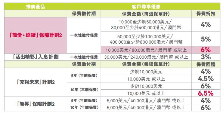 凡成功投保任何一款个人基本保障计划,且平均每月基本保费达以下指定金额,即可尊享高达10,000港元保费优惠。
