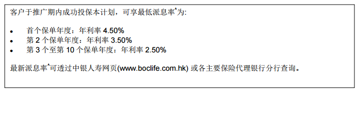 成功投中银人寿承保的「人民币万用寿险计划 II」,可享首两个保单年度最低派息率优惠,兼享提取费用和退保费用的宽减优惠。
