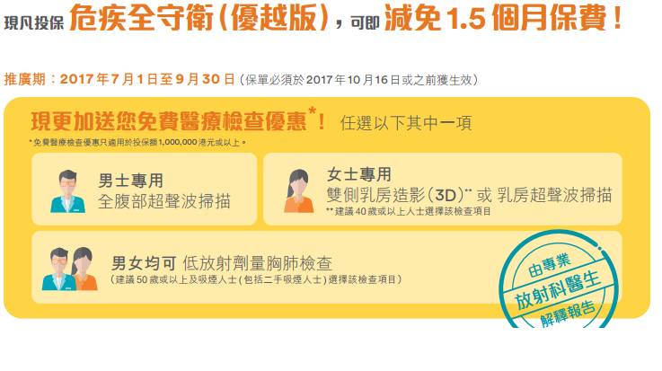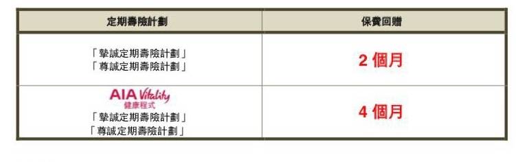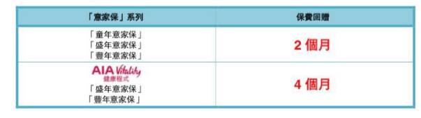 于2017年5月29日至2017年8月25日期间,成功投保表一之指定全新医疗及保障基本计划及/或附加契约,并符合表二之持有保单类别数目要求(包括新申请及/或现有保单),每份全新合资格保单/合资格附加契约即有机会获享高达三个月保费回赠!