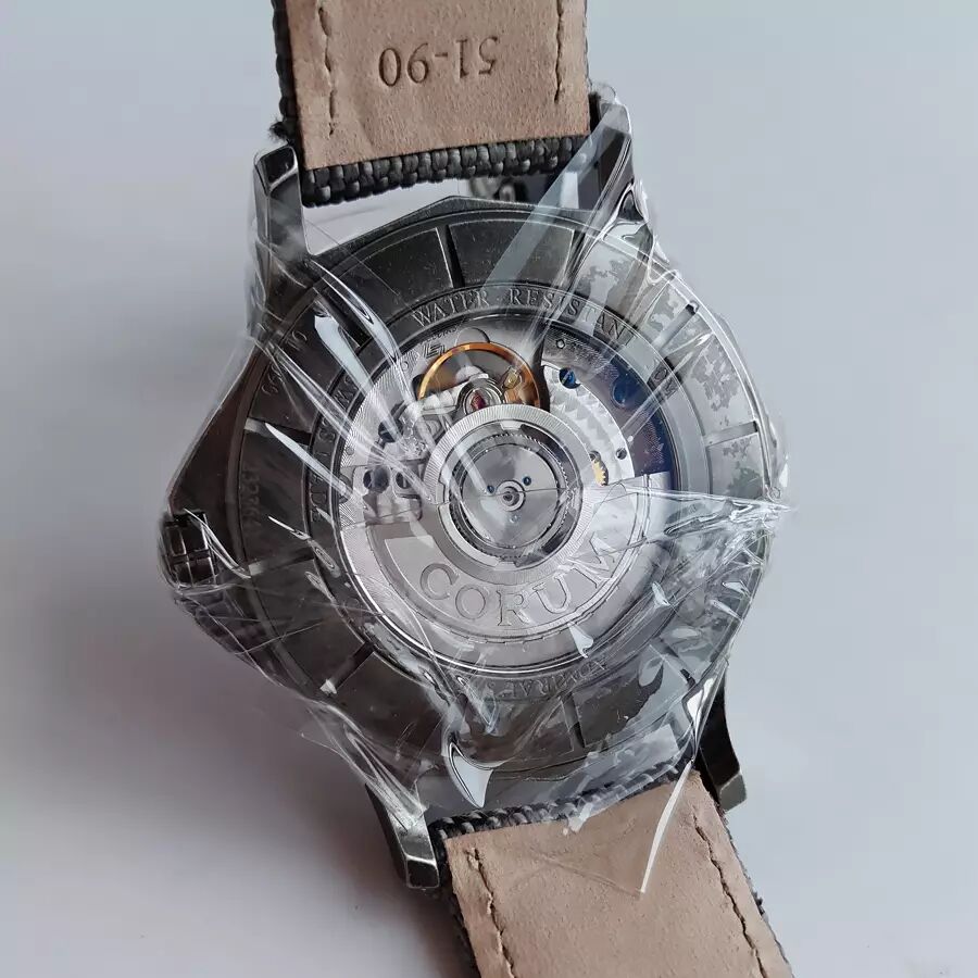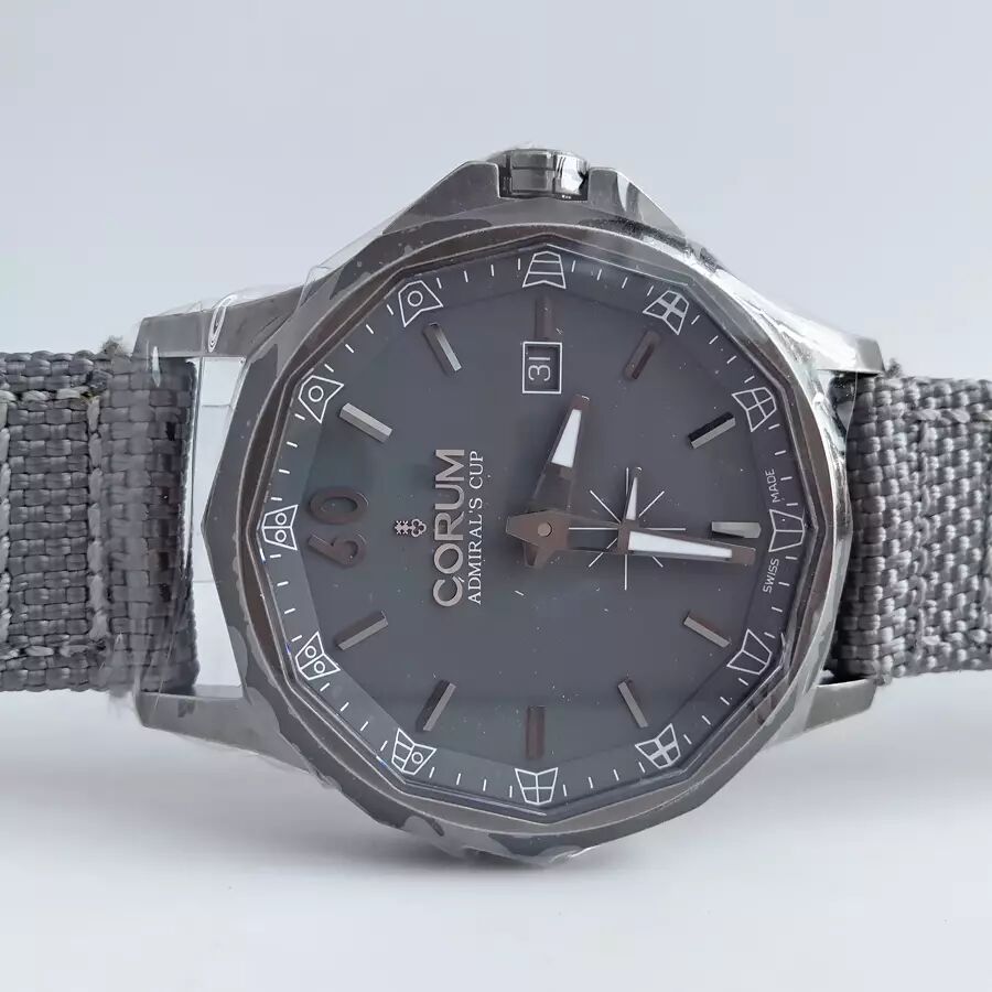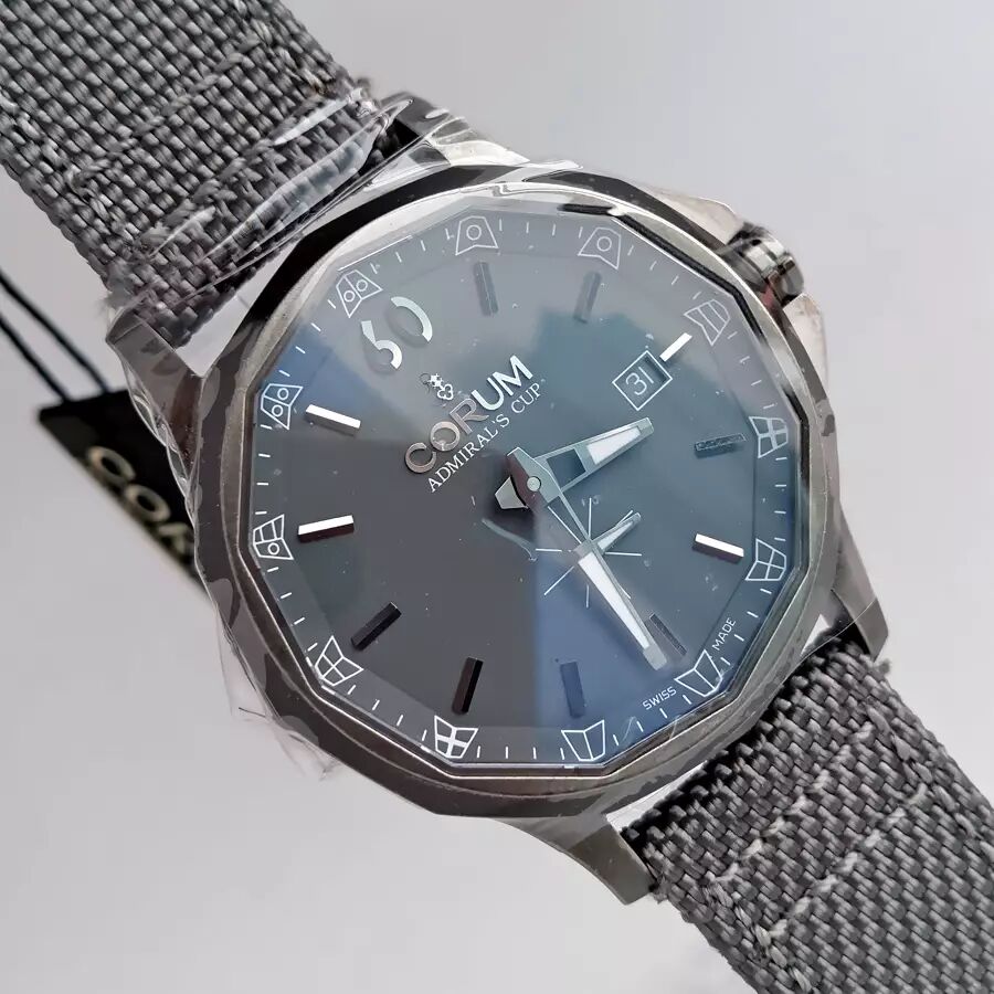 Corum昆仑Admiral's Cup海军上将杯系列小三针男士腕表。型号:395.119.98/0619 AG19(灰钢灰盘)整表全部精钢打造,42MM大表径,型男首选,硬汉必备!,立体钉条刻度+太子妃形指针,12边拱形表壳及刻度位置上的十二面航海旗,是海军上将独有的典型标志,双层镀膜蓝宝石水晶镜面及底镜,妖艳蓝光,摄人心魄!精打磨背透昆仑自厂自动机械机芯(这年头自厂芯就是高价的代名词,更何况是名表海军上将)!在腕表表冠两侧设有一对表冠护肩,坚固耐用防撞击。3点位置日历窗口显示,户外运动编织表带搭配针扣,笔直未穿孔,夜光凌厉~!