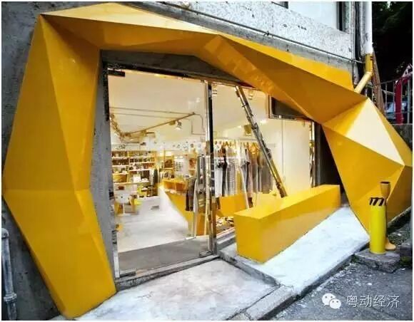 以鲜黄色的店面和雕塑般的大门