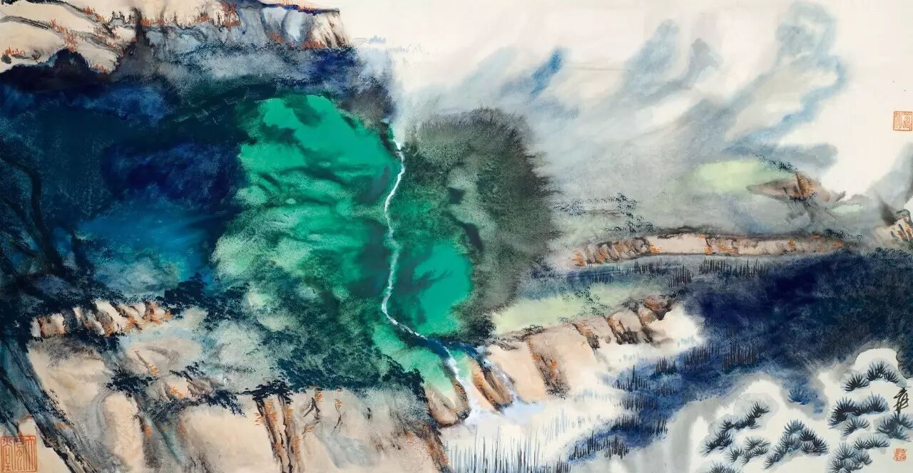 潑彩畫風的開創,最能代表張大千前無古人的歷史地位。青藍色染的巍峨大山,在粗獷的表像中卻有細緻的內涵底蘊。山間的氤氳雲氣和蔥蘢草木以留白法和些許墨彩寫出,又橫向鋪染開來水法、墨法和潑彩之法交相輝映,靈動流轉而不壅塞阻滯,氣勢磅礴渾厚,透顯出深邃的空間層次。