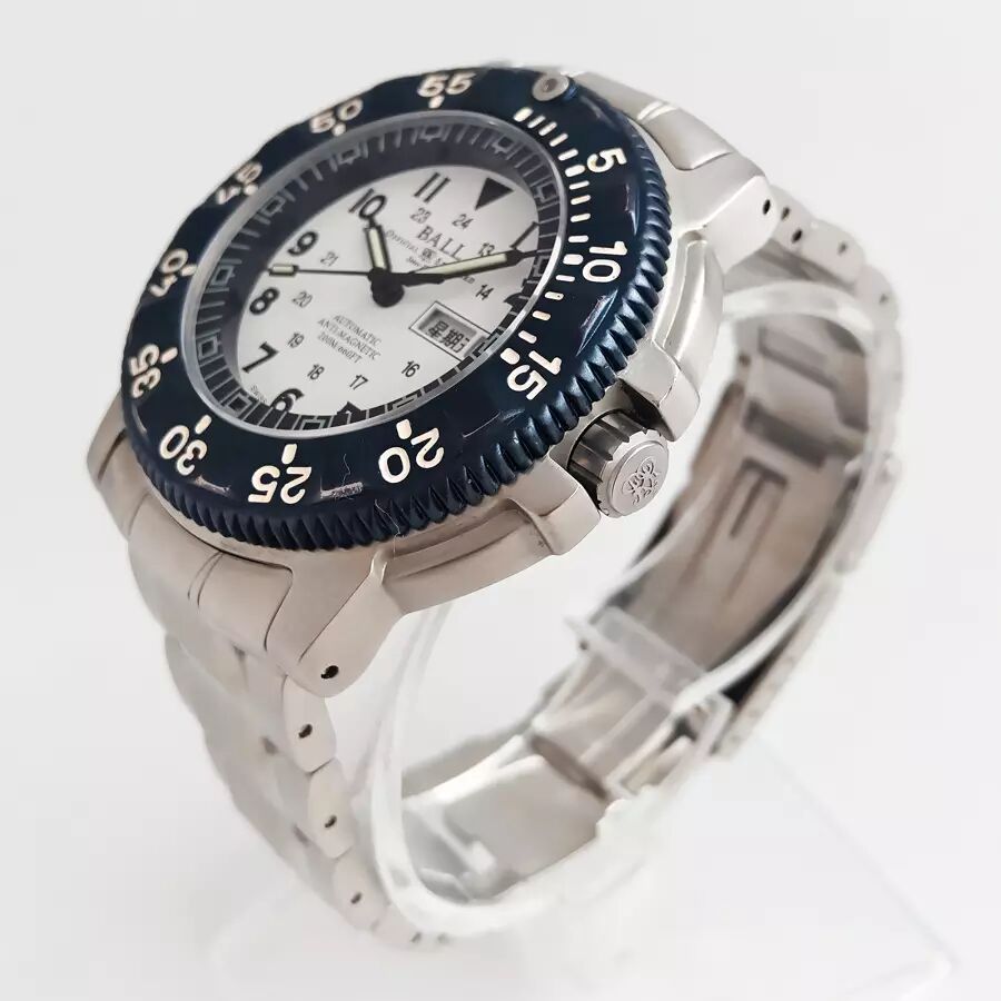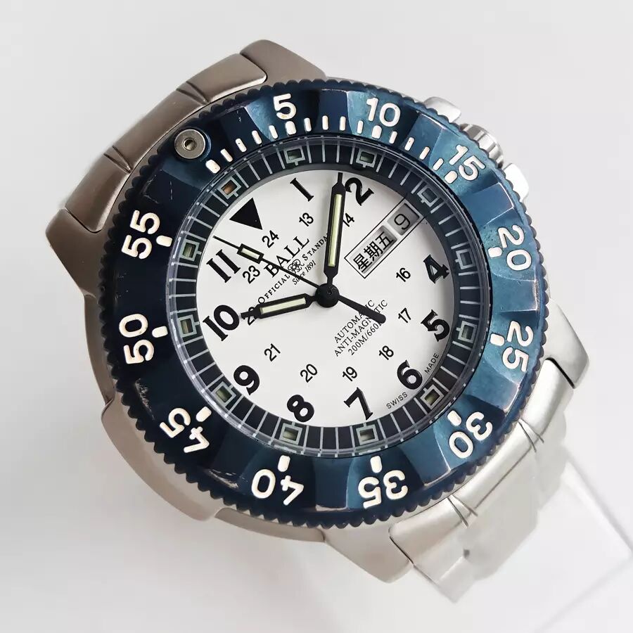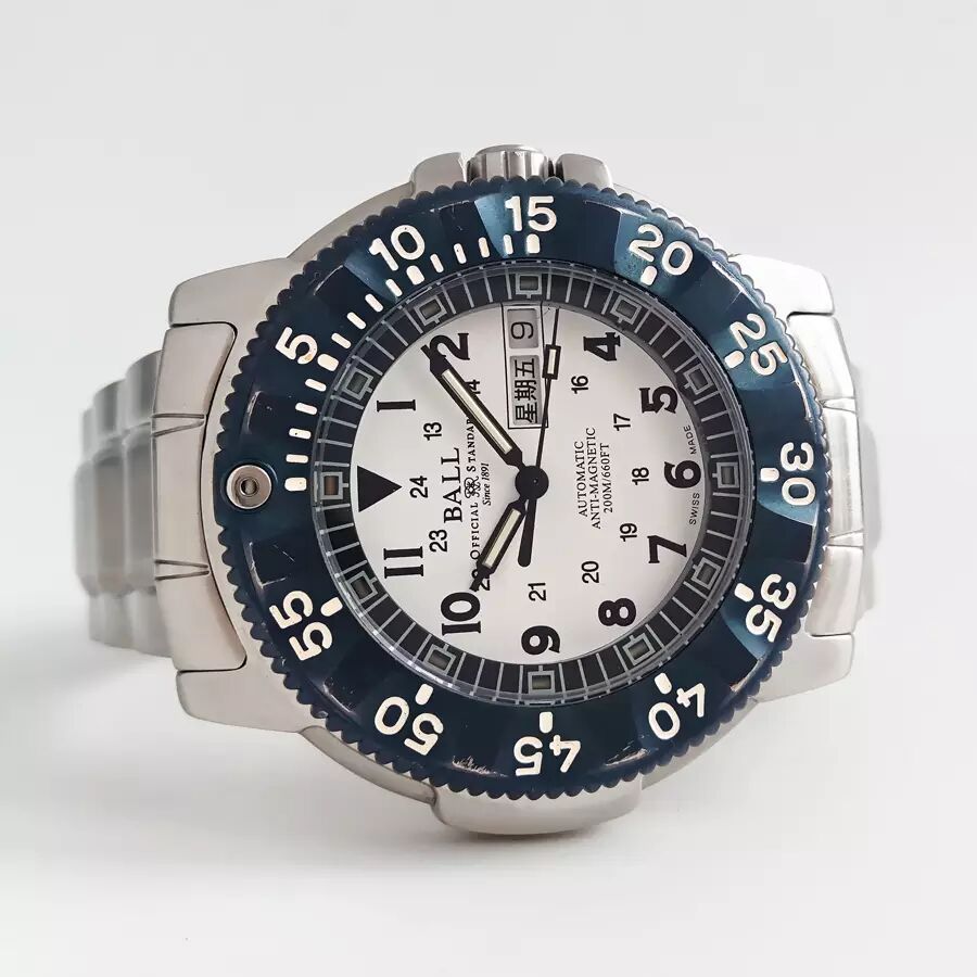 BALL波尔列车长系列双历机械潜水运动男士腕表。型号:DM1012B,整表精钢打造,43MM大表径,运动休闲都OK。白色表盘,阿拉伯数字刻度,氦气大灯夜光,剑形指针,蓝宝石水晶镜面,搭载自动机械机芯,锁把锁底,足以应对日常防水所需,游泳洗澡都能戴。3点位置日历+星期窗口显示,可单项旋转外圈,精钢表链,折叠扣,夜光凌厉!