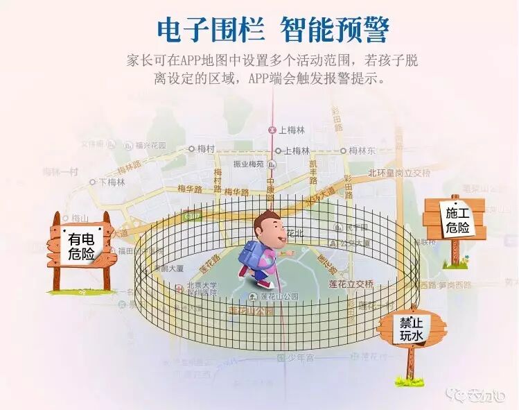 智能定位系统。LBS基站定位,打开手机客户端,即可随时随地知道孩子的所在位置。