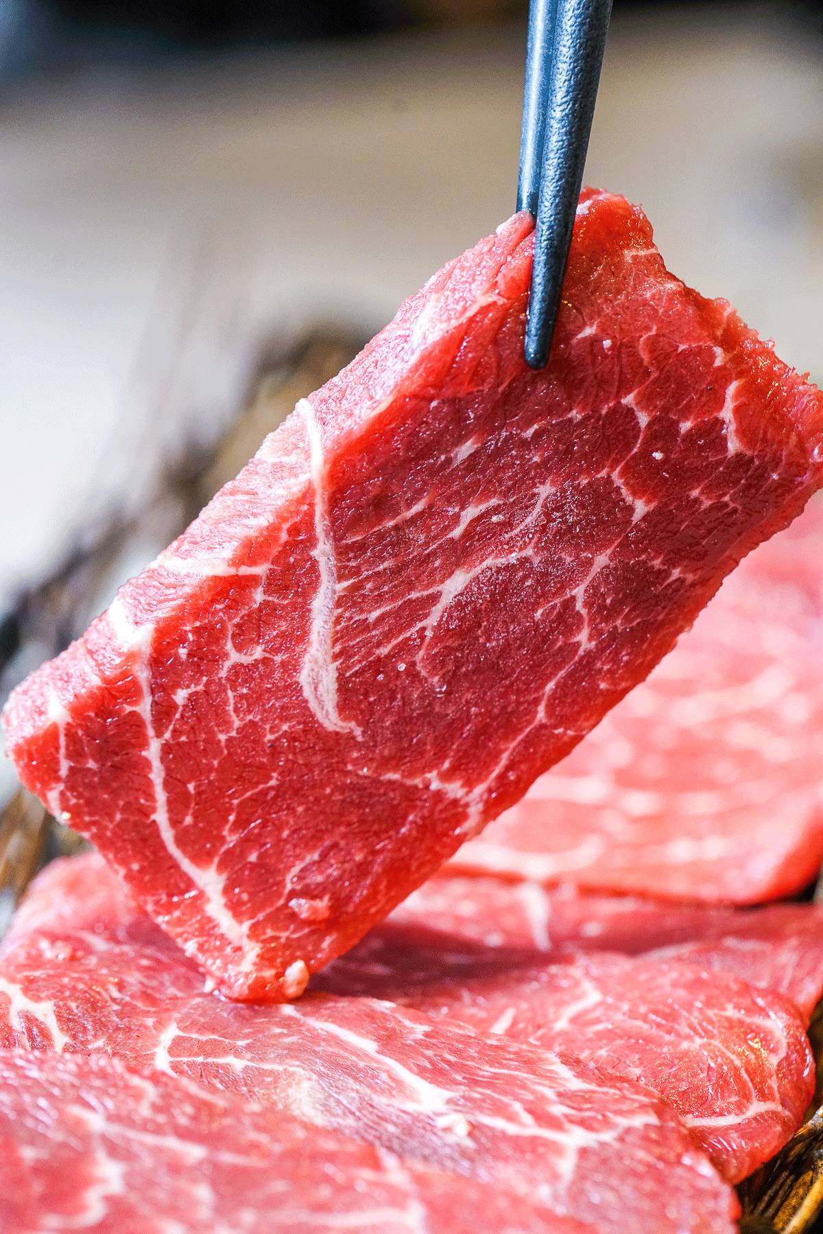 和牛眼肉肉质最细腻、油脂也丰厚,有股淡淡的牛油香味。筷子轻轻一按油脂就溢出来了。