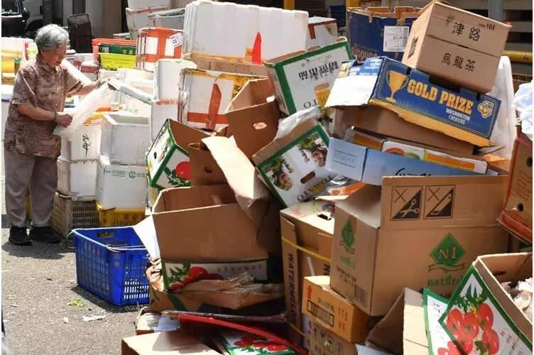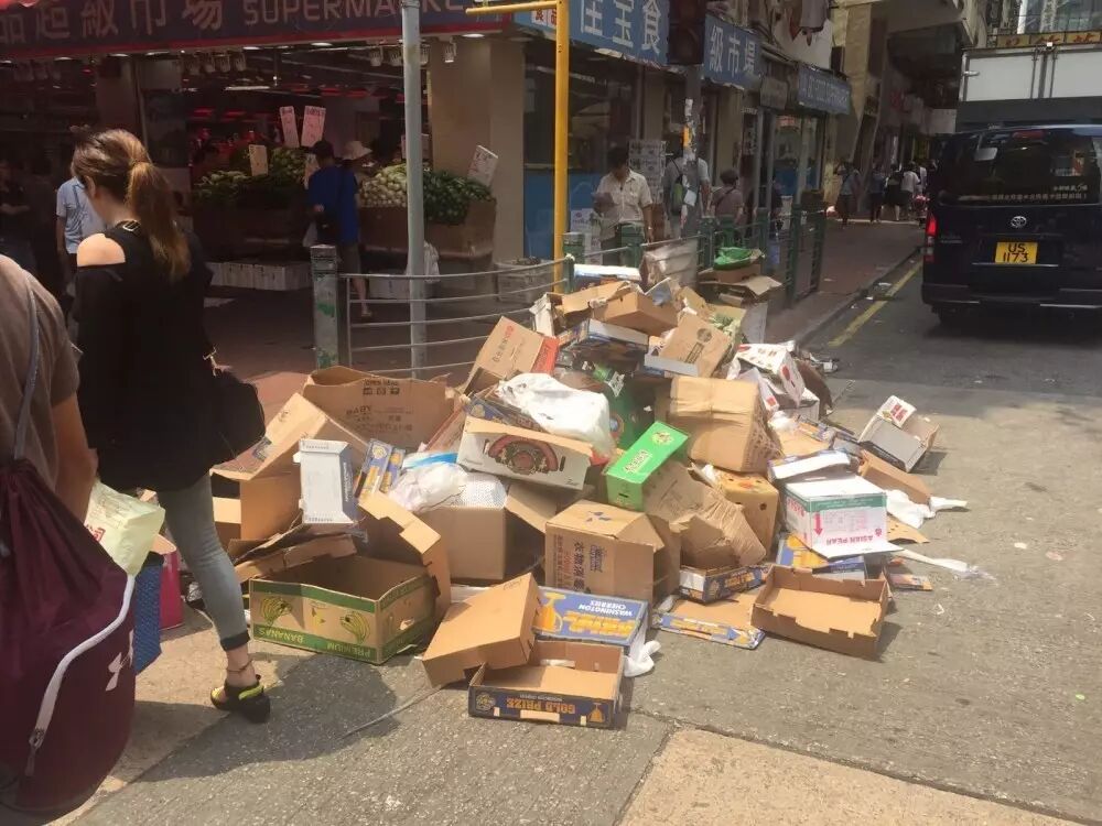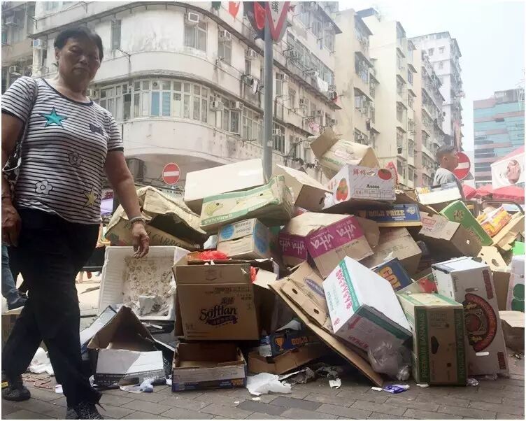 回收商停收废纸的第二日,香港已是满街纸皮无人清理,出现废纸成堆的惨况。无论是铜锣湾街头,还是在深水埗街市外,都出现由纸皮箱堆成的垃圾山。