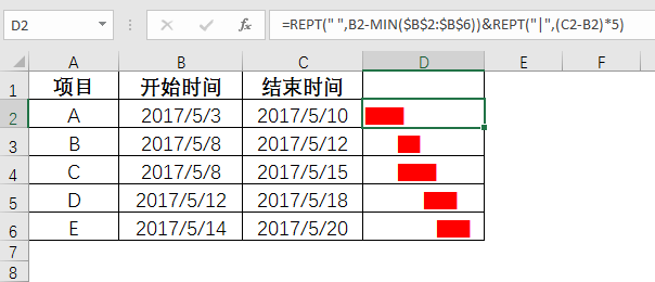 如下图所示:在D2单元格输入公式:=REPT(" ",B2-MIN($B$2:$B$6))&REPT("|",(C2-B2)*5) 公式公式最后乘以5是因为一个空格的宽度约等于5个小竖条的宽度。如果你想将图表拉长,只需要在整体公式最外面乘以一个具体数字,就能达到你想要的长度。