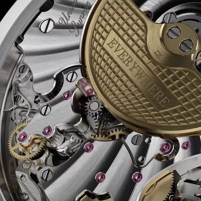 该USS机芯共使用了84枚齿轮,145枚齿轮相关零件,85颗宝石轴眼,并且拥有4个差动变速装置。为保护这些创新发明,KRAYON已为之申请了三项专利。由白金打造的自动上链珍珠陀,可提供72小时动力存储,振动频率为3赫兹。秉承瑞士传统的钟表技艺,Everywhere腕表的装饰工艺全由手工完成。