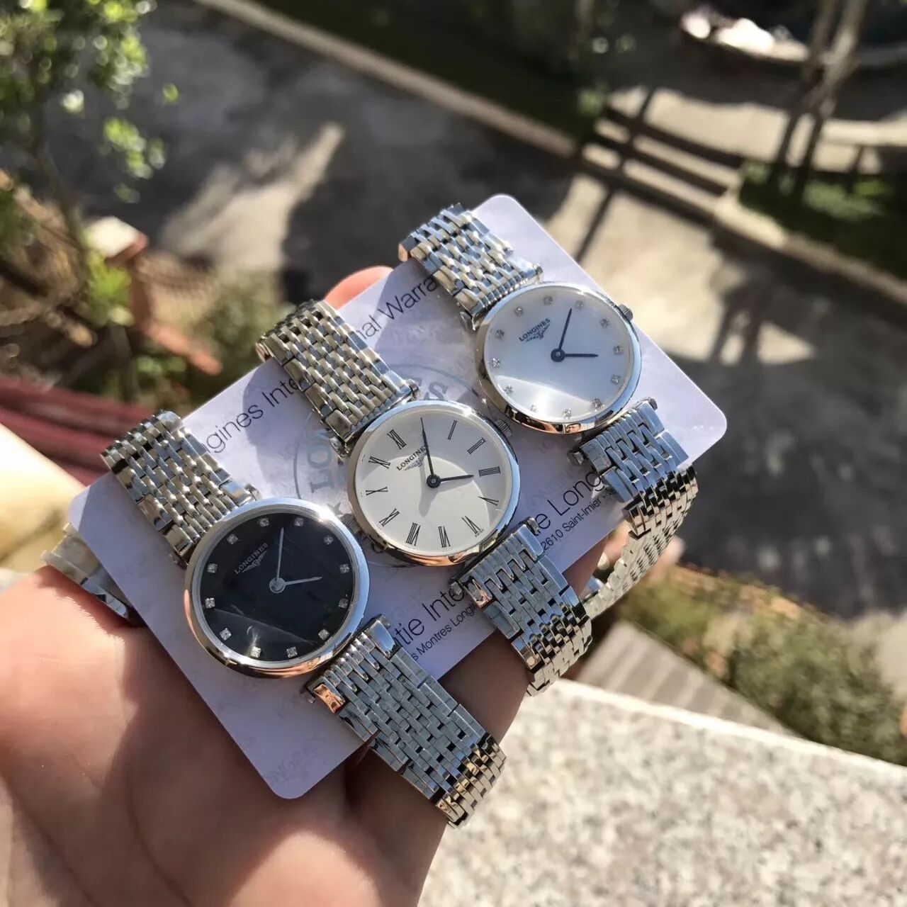 这个表盘是母贝材质,对光️有七彩效果,也可以很明显看出椭圆形蓝宝石镜面,上图三块手表都是石英表,表径都是25mm,表链都可以拆卸,瑞士进口朗达机芯