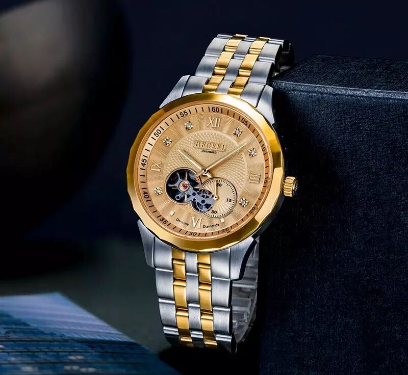 腕表的迷人之处从表盘延伸开来, BEGEEL宾爵飞轮镂空机械手表电镀24K黄金表带表壳,表镜为防刮蓝宝石镜面,其中1、2、4、8、10和11点更以镶嵌天然南非真钻刻度标示。这个外形设计超赞,狂放不羁、霸气内敛。