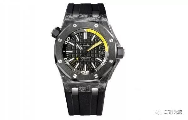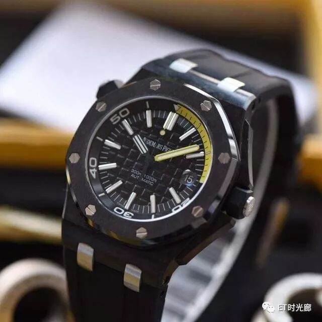 Tapisserie”超大格纹装饰,搭配白金荧光立体时标和黑色皇家橡树指针(黄色分针)、黑色旋转内表圈搭配潜水刻度和黄色60至15分钟区域。
