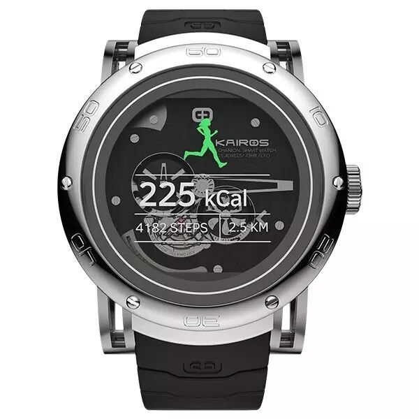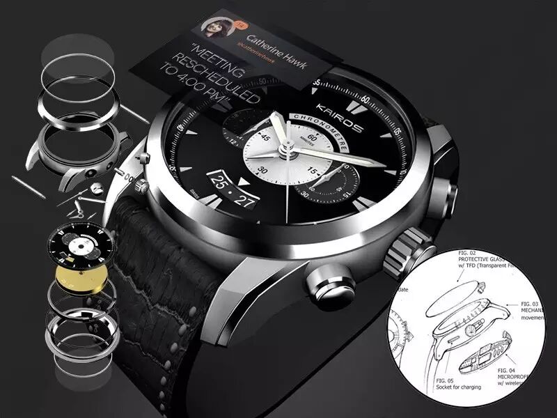 这是由创业公司 Kairos 设计的一款集机械智能腕表,就是说在拥有机械手表的前提下还拥有智能手表的各项功能!OLED 屏幕采用点阵屏技术,所以这是一个全功能的显示屏,可以显示来自手机的各种通知信息。。。