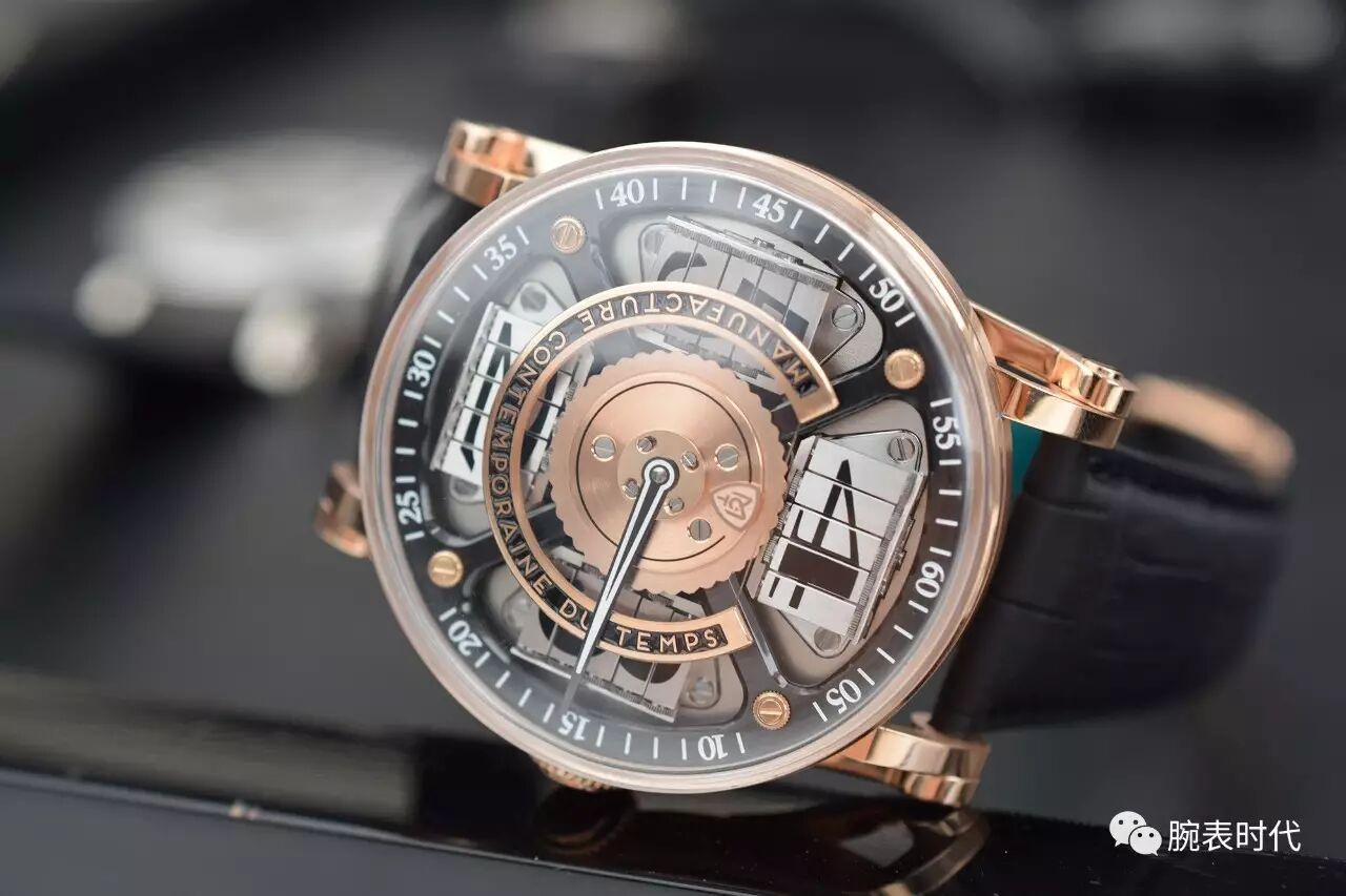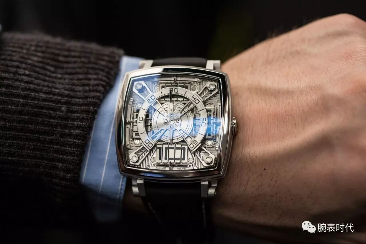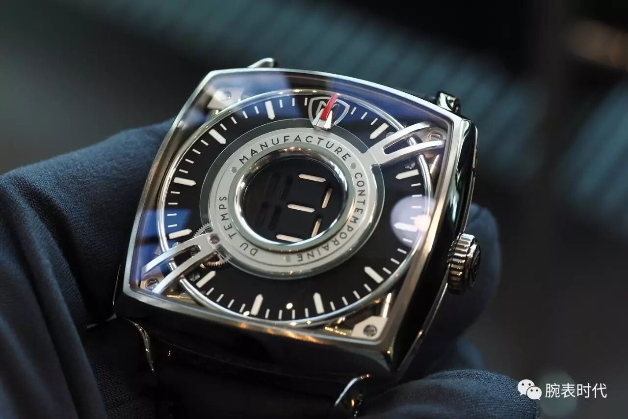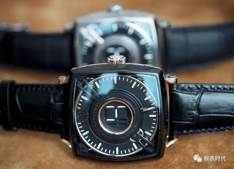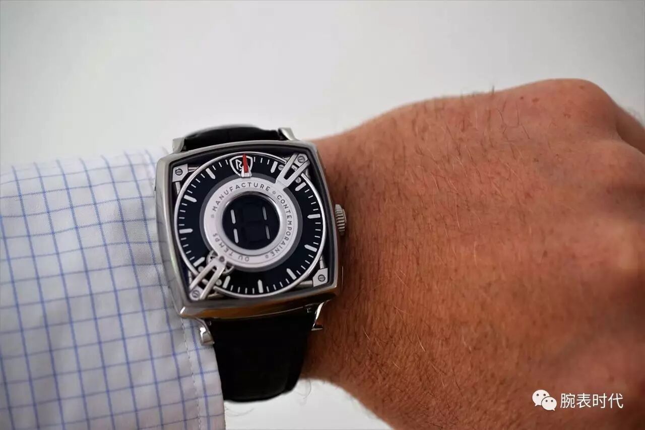 这款腕表的设计灵感是来源于上个世纪七十年代的电子表,在设计上,除了它富有个性的方形表壳之外,这款腕表应该也算是第一个在表盘中心显示数字时间的机械腕表了。,分钟则由外圈的指针来指示。