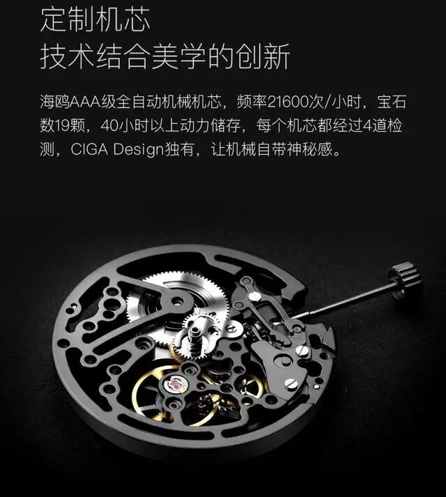 机芯是定制的海鸥AAA级全自动机械机芯,共有94个零部件,频率21600次/小时,宝石数19颗,动力存储可达40小时以上。