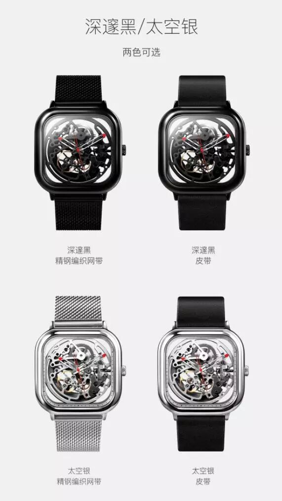 玺佳全镂空机械表配色有深邃黑、太空银两种,腕带为精钢编制网带,有品还会赠送真牛皮表带。