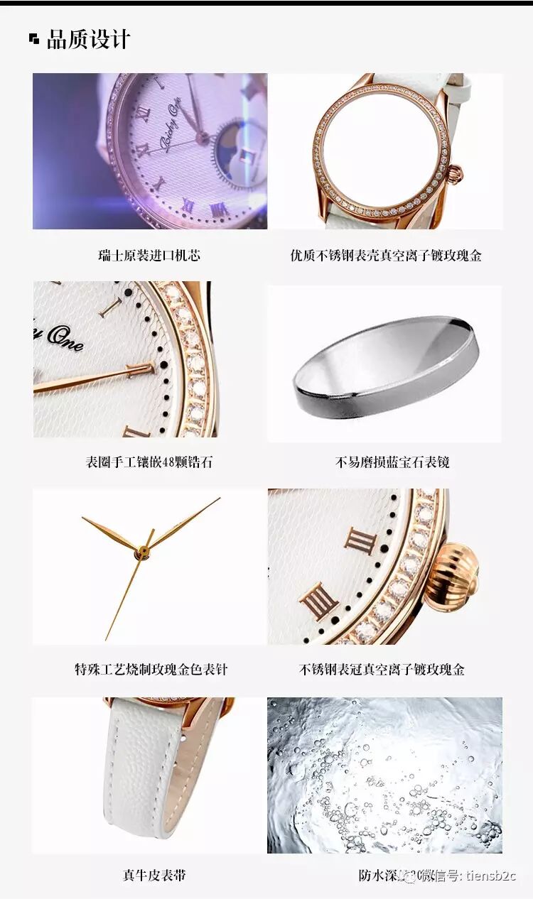 6. 不锈钢表冠真空离子镀玫瑰金 7. 真牛皮表带 8. 防水深度30米 |