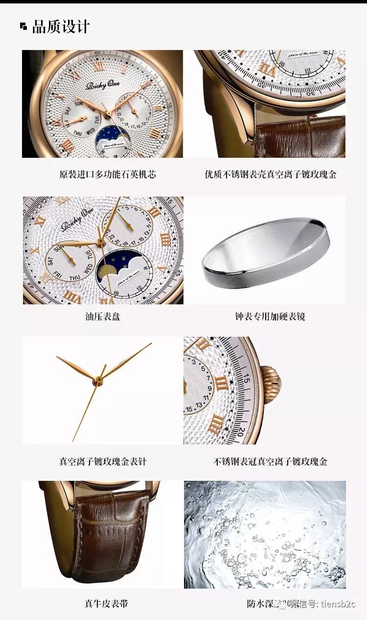 特殊工艺烧制玫瑰金色表针 6. 不锈钢表冠真空离子镀玫瑰金 7. 真牛皮表带 8.
