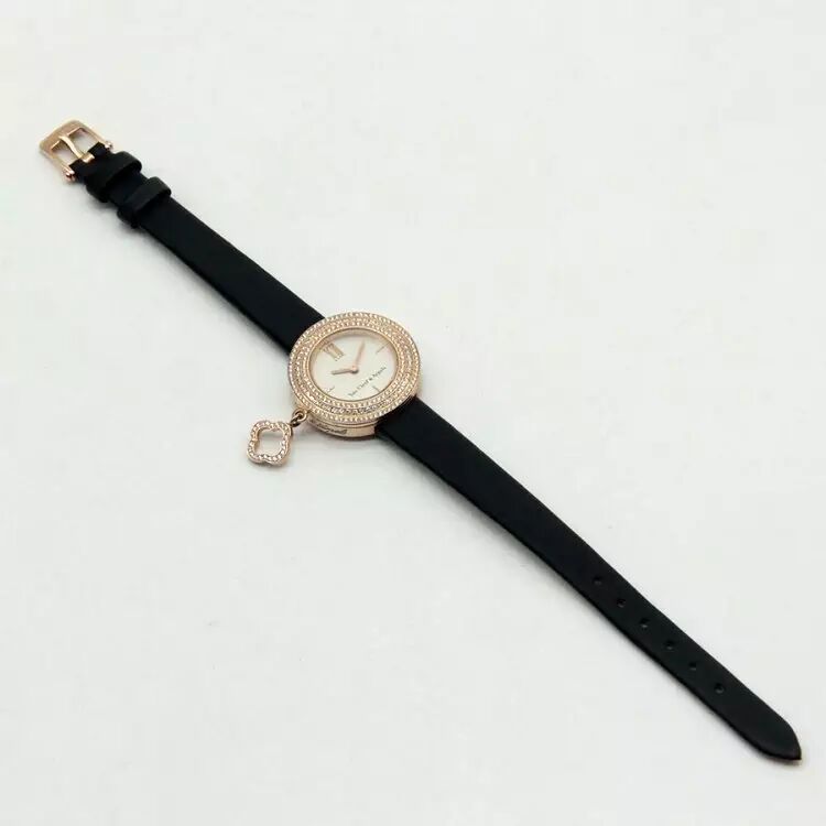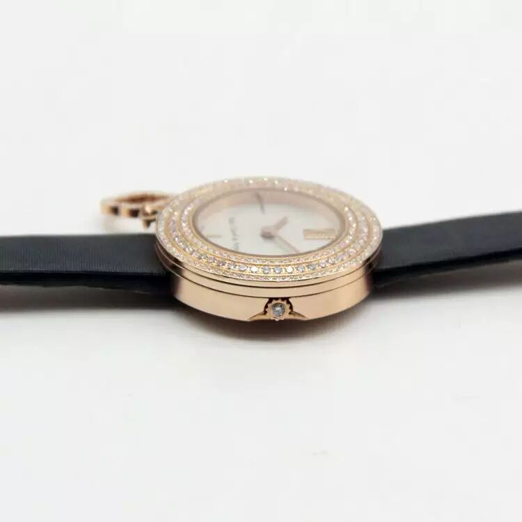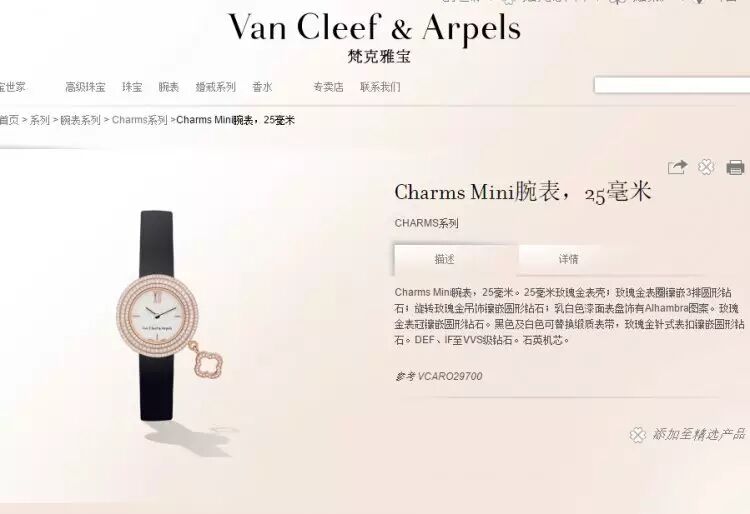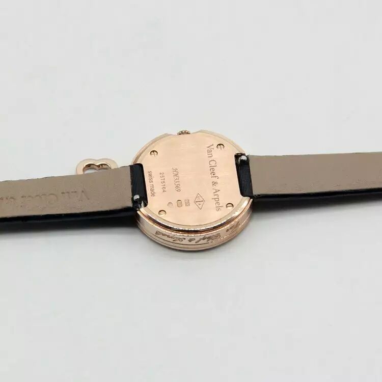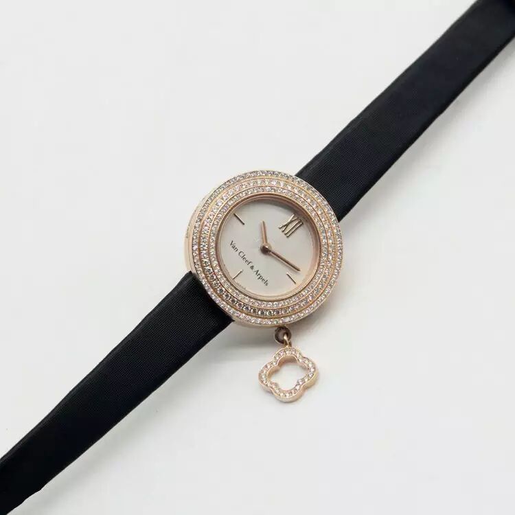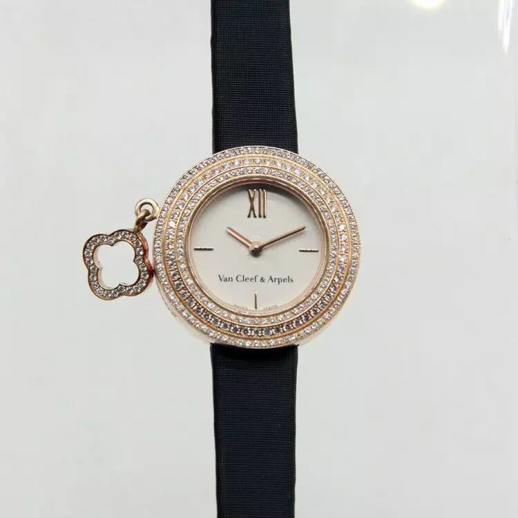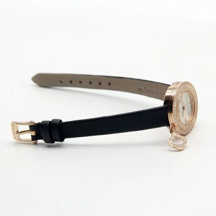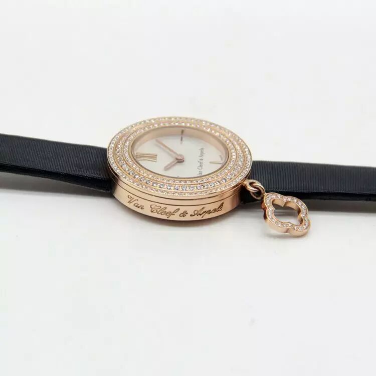 Van Cleef&Arpels梵克雅宝Charms Mini系列玫瑰金钻圈四叶草吊饰女士石英腕表。型号: VCARO29700,百年历史的顶级珠宝世家,传承巴黎的艺术气息,紧随自然的韵律,将腕表与珠宝结合,演绎着华丽优雅、和谐轻盈之美。整表全部由18K玫瑰金打造,包括每一刻螺丝钉都是,奢华靓丽!25MM表径,乳白色漆面表盘,表圈侧面饰有可旋转四叶草Alhanbra镶钻图案,自由活泼。大罗马数字+钉条刻度,剑形指针,蓝宝石水晶镜面,18K玫瑰金表圈密镶3排天然美钻,原镶钻石,精致华丽,阳光下,绚丽非凡,犹如一件顶级的珠宝,夺人眼球!表把顶端亦镶嵌一颗钻石,搭载精准省事的石英机芯,女士佩戴极佳。原装黑色丝质绢带,柔软舒适,笔直未折叠,传统针式表扣。