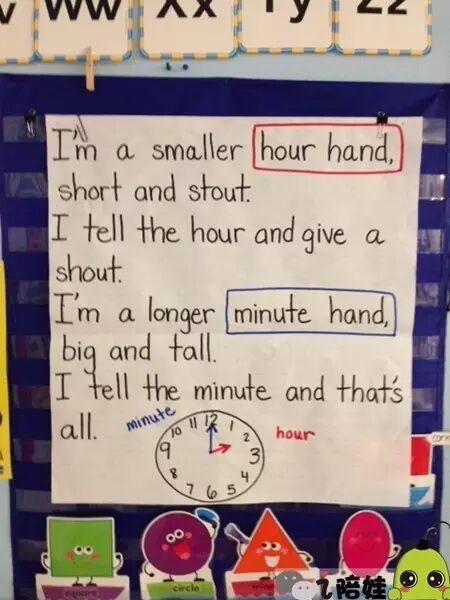 钟表DIY好后就可以教娃认识时间啦,外国人的教室里会贴着各种学习海报,很多知识点会编成好记忆的顺口溜。这个认识钟表的顺口溜稍给妞们翻下: