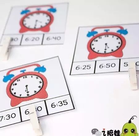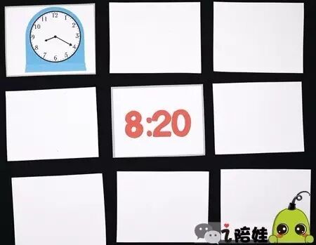 娃学会认整小时以后,可以准备一些小卡片,一种是数字表示,一种是钟表表示。