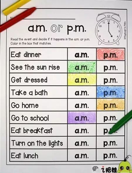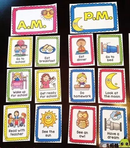 如果娃都知道A.M和P.M,是不是更高级啦,通过各种日常。去学校、早点、做作业,来理解上下午的界限