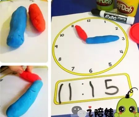 还可以画一张钟表,用粘土做分针和时针,你写时间,娃来摆,反过来也可以。