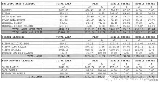 首先必须编写计算机程序,通过几何规则识别板片,主要的目的是区分出平板、单曲、双曲,然后对这些离散的板片进行归类,需要对曲面板展开后计算表面积,最后通过计算机程序进行自动汇总,这种统计模式非常快速、准确。