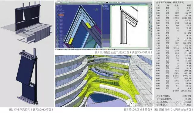 (1)BIM模型能提取和管理成千上万的非标准单元幕墙的设计数据,包括面板、龙骨及连接件的几何、材料、建造信息,庞大的数据呈指数增长。