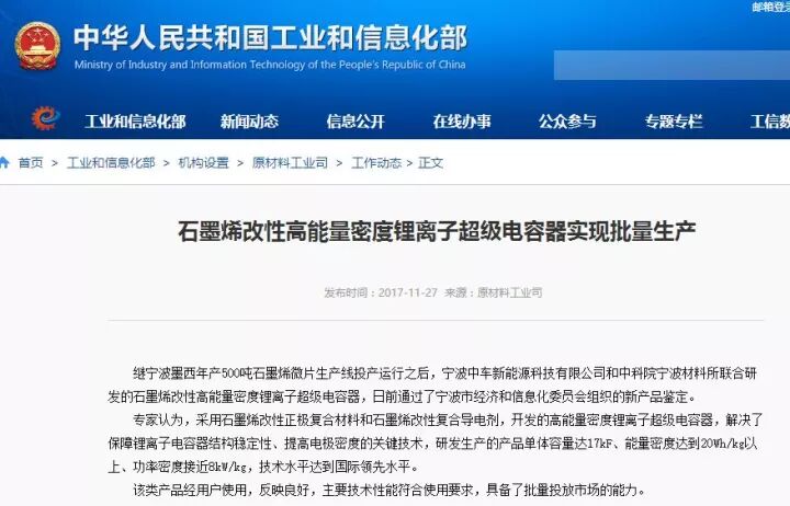 石墨烯材料是目前世界上已发现的最薄、最轻、最强的新型纳米材料,具备极佳的电化学储能特性,超快速充放电、循环充电等,将为汽车动力电池带来颠覆性的变革。因此,石墨烯改性高能量密度锂离子超级电容器实现批量生产,将解决新能源车发展的重要障碍,带动行业实现快速发展。
