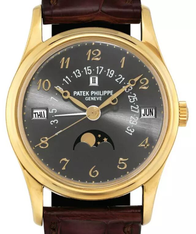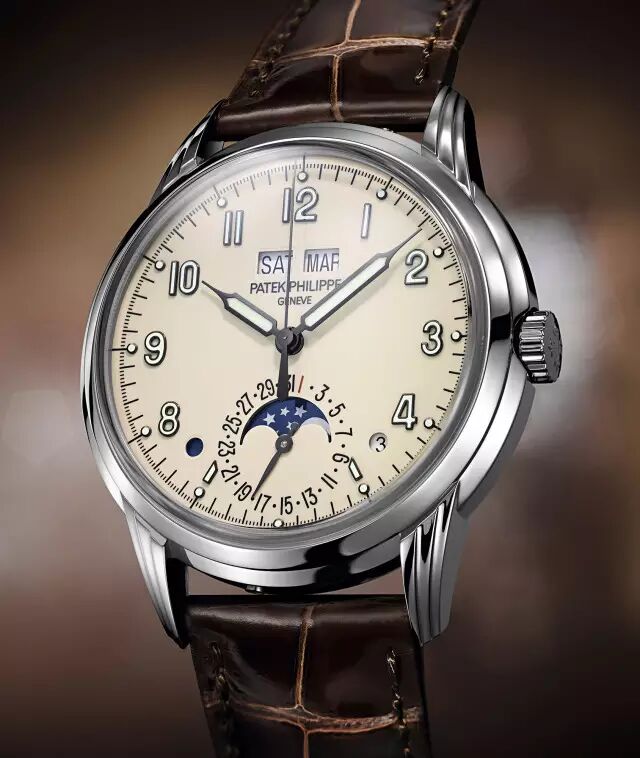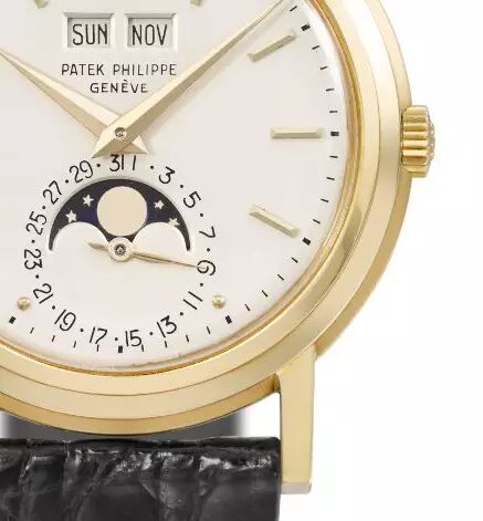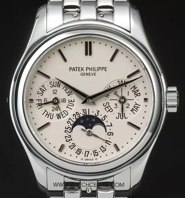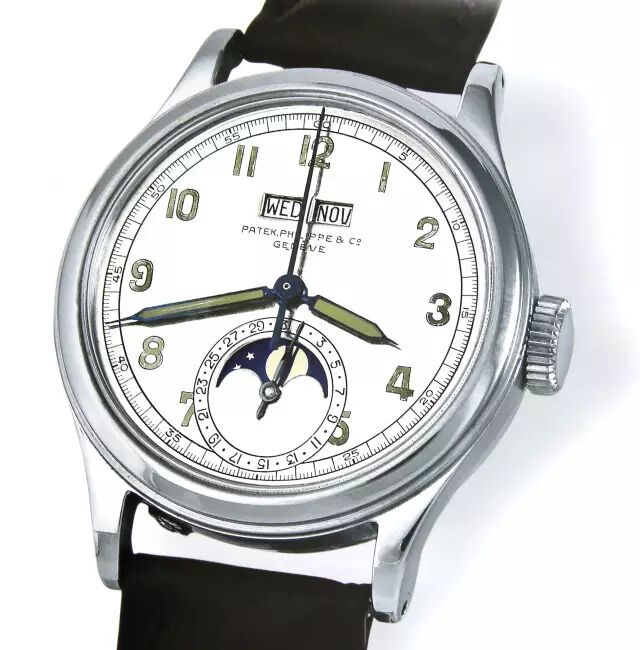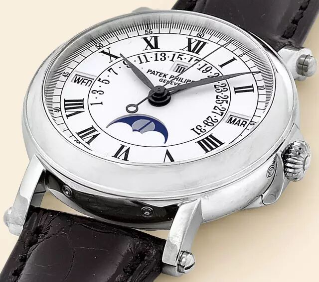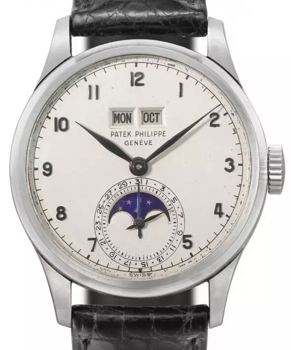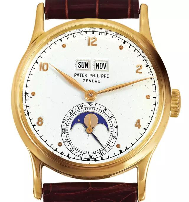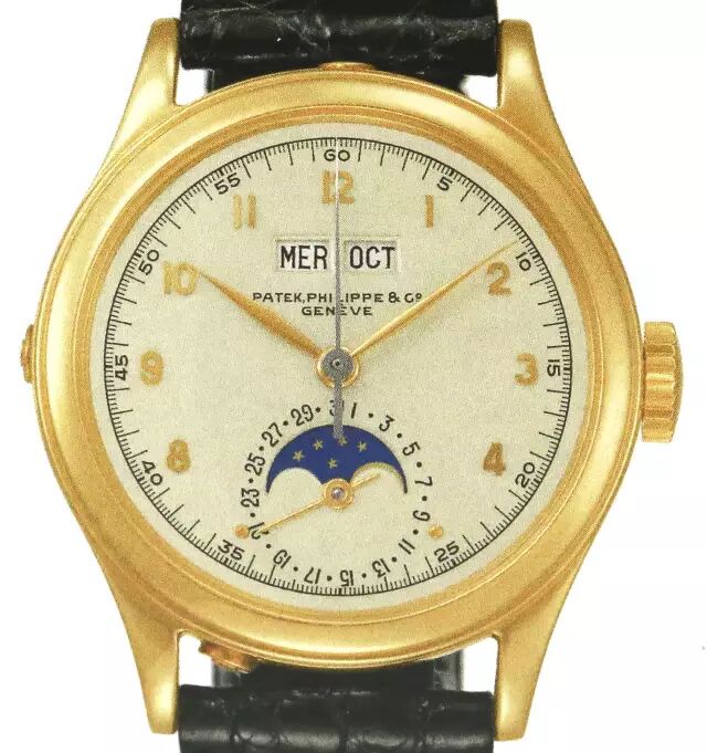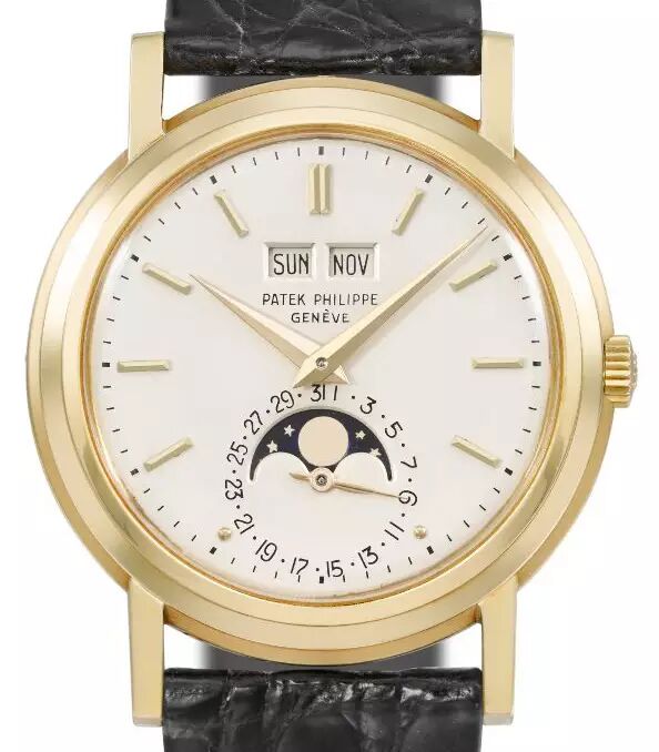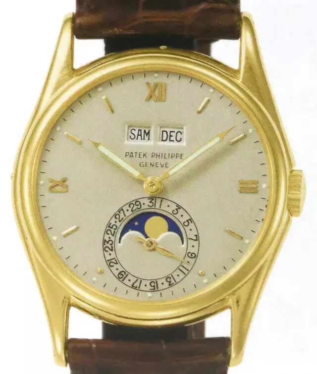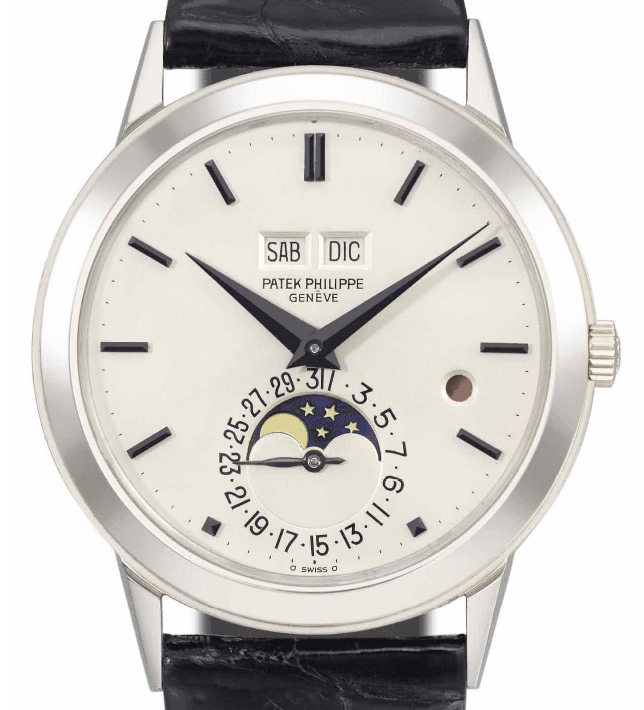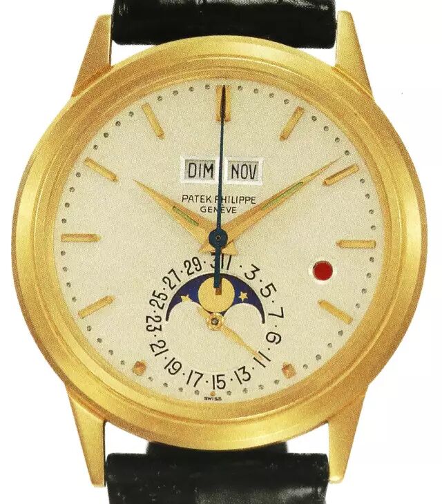 Ref.3448盘面布局简约,均衡,表壳造型古雅清高,直径37mm,也适合佩戴,乃是完美的万年历杰作。其中黄金款多数在百万身价,白金版比黄金版视觉上更加素雅,更加极致,当然数量也更少,往往是两百万打底……铂金和红金款都是极少见的,恐怕在五指之内。一枚红金款曾在2011年连佣2,099,000瑞郎。其实对于一般藏家而言,有一枚白金好品Ref.3448人生已很圆满啦。虽然闰年显示应该在下一代Ref.3450上出现,但就这么奇妙,可能孤品白金黑针有闰年显示的Ref.3448G,2013年连佣1,623,750瑞郎。