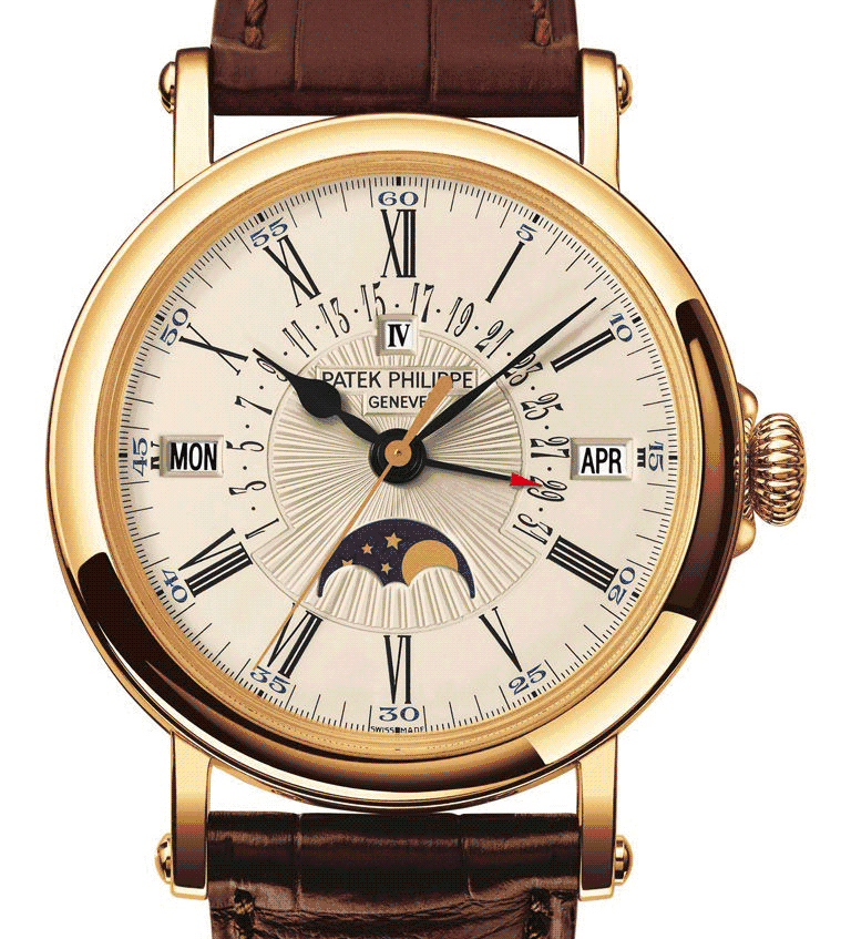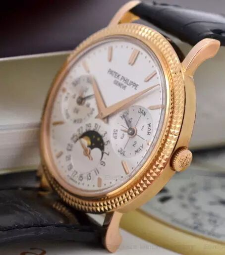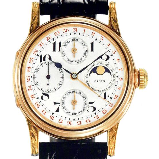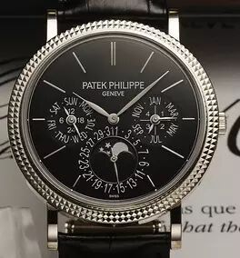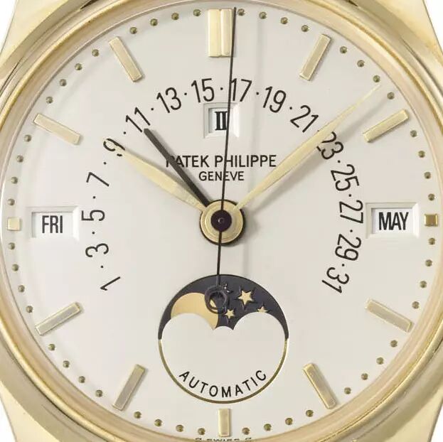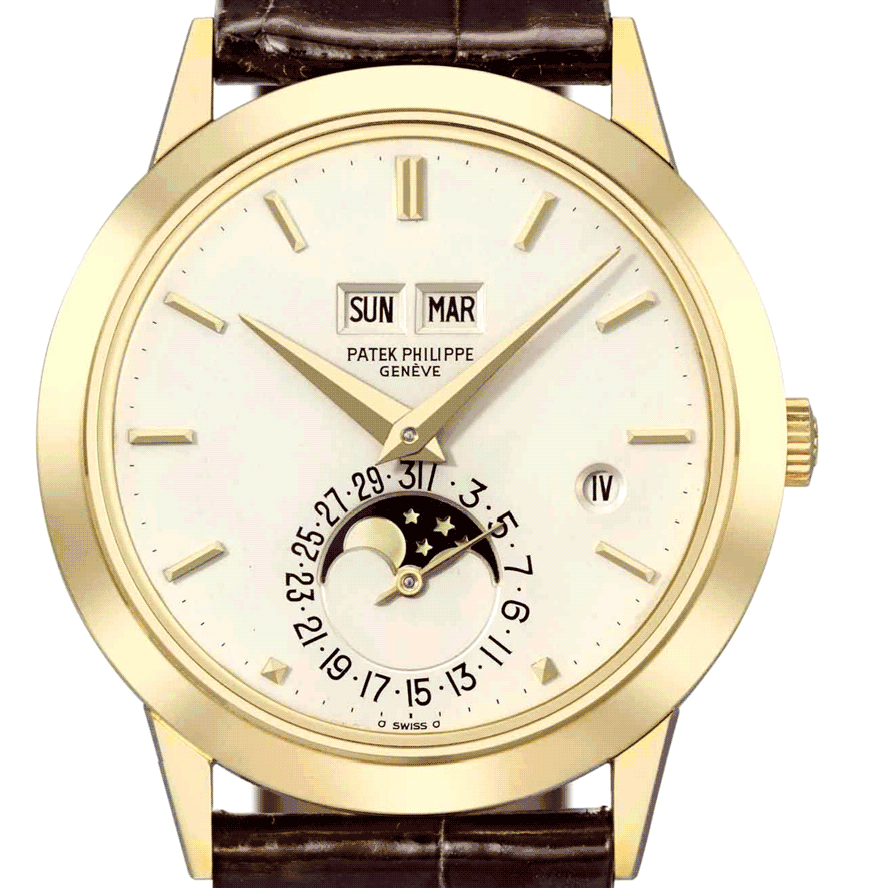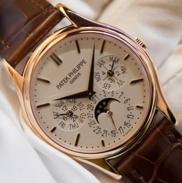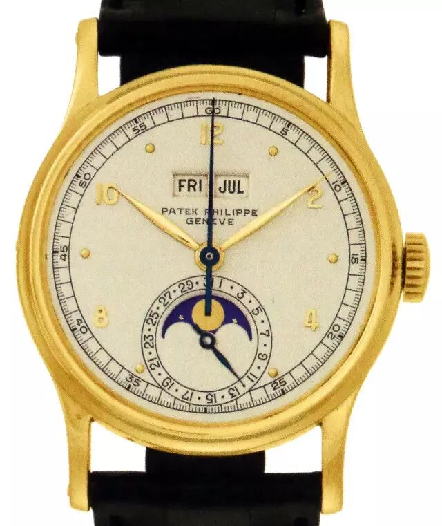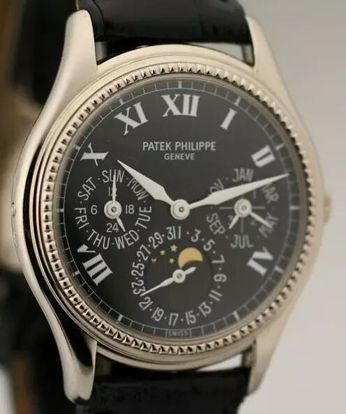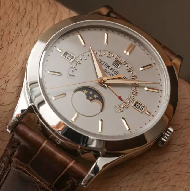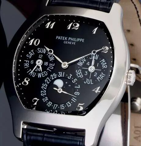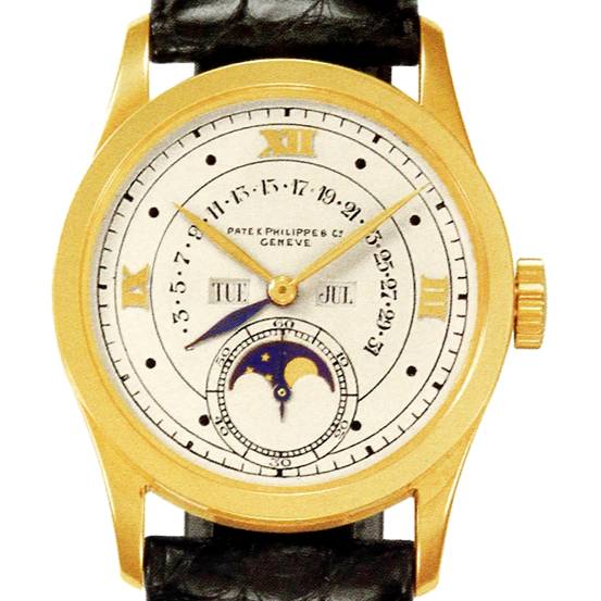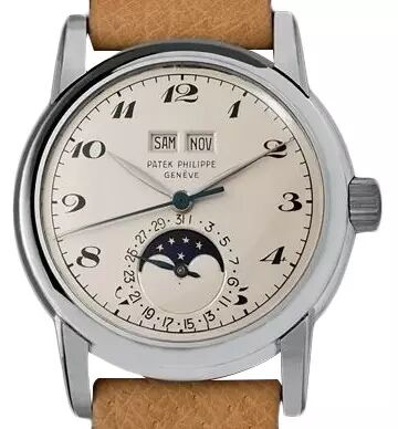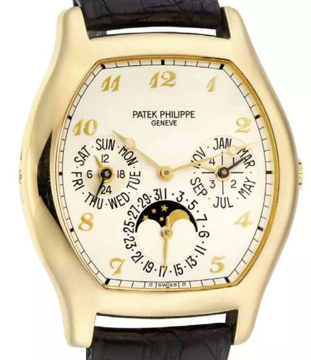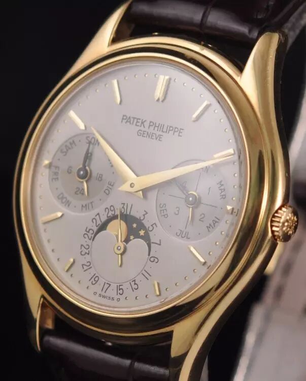 Ref.3448盘面布局简约,均衡,表壳造型古雅清高,直径37mm,也适合佩戴,乃是完美的万年历杰作。其中黄金款多数在百万身价,白金版比黄金版视觉上更加素雅,更加极致,当然数量也更少,往往是两百万打底……铂金和红金款都是极少见的,恐怕在五指之内。一枚红金款曾在2011年连佣2,099,000瑞郎。其实对于一般藏家而言,有一枚白金好品Ref.3448人生已很圆满啦。虽然闰年显示应该在下一代Ref.3450上出现,但就这么奇妙,可能孤品白金黑针有闰年显示的Ref.3448G,2013年连佣1,623,750瑞郎。