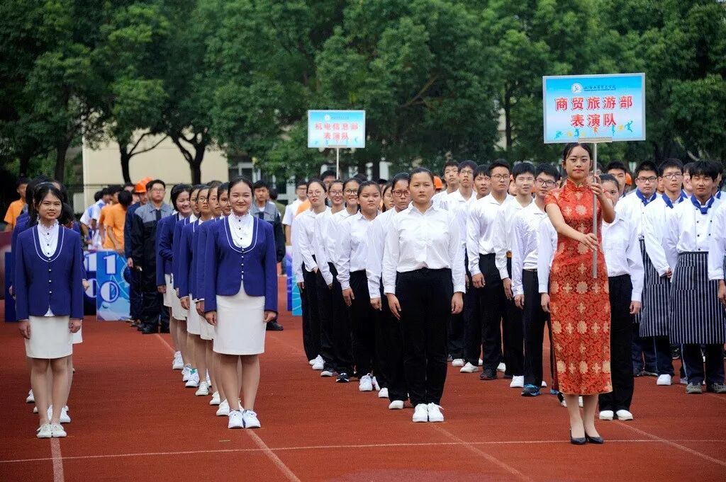 接着是各表演方队入场。商贸旅游专业部、机电信息专业部分别以极具专业特色的表演诠释着我校在专业建设的成效。由校武术队、踢跳队、足球队、啦啦操队、科技社的展示表演,或刚强有力、或灵动飘逸,他们都训练有素、活力四射;科技社的无人机操控表演展现了科技的力量……表演队呈现出精彩表演的背后,都与班主任、指导老师等的辛苦付出密不可分。他们利用每天中午甚至周末等休息时间集结表演队的同学们进行刻苦的训练。