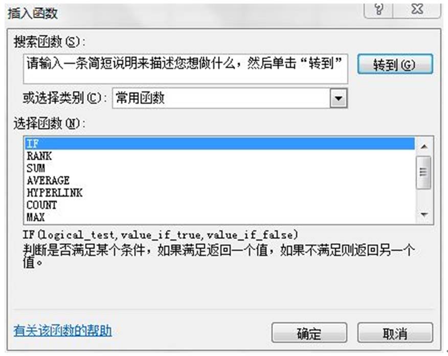 (2)从对话框中输入函数:在单击选择要输入函数的单元格后,单击编辑栏中的插入函数按钮fx或者单击“公式”选项卡中“函数库”组内的“插入函数”按钮或其他类别的函数按钮。当单击任一类别的函数按钮时,将随即打开一个包括该类别所有函数的下拉菜单,供用户选择;当单击插入函数按钮fx后,将打开“插入函数”对话框,如图4-5所示。若输入的函数存在于“选择函数”列表框中,则单击它后再单击“确定”按钮进入下一步;若不在,则从“选择类别”下拉列表框中挑选函数类别,再从“选择函数”中 挑选出函数,接着进入下一步。