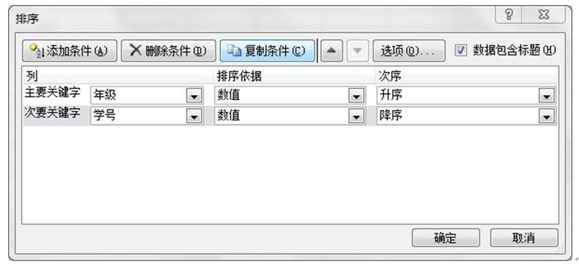 在“排序”对话框中,首先对第一个(主要)关键字进行设置,接着单击“添加条件”按钮,给出(次要)关键字的设置行,进行设置,最后完成设置后单击“确定”按钮。图4-6所示的数据表是按照年级的升序排列,如果年级一样则按照学号的降序排列。