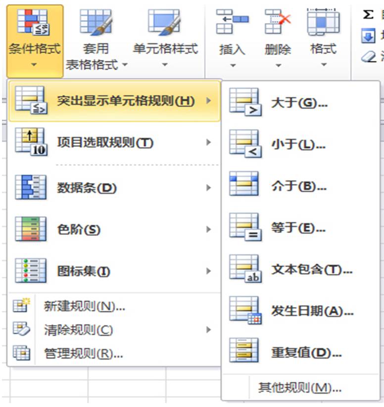 对工作表中某一列数据进行等级区别时可以用条件格式来设置。同此功能可以通过“开始”选项卡中“样式”组内的“条件格式”按钮来实现,单击此按钮,将打开一个下拉菜单,如图4-4所示。此菜单包括“突出显示单元格规则”、“项目选取规则”、“数据条”、“色阶”、“图标集”等选择项,当单击任一选项时又会弹出下一级菜单。