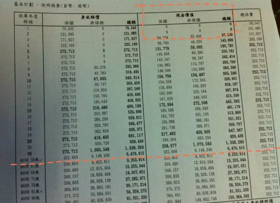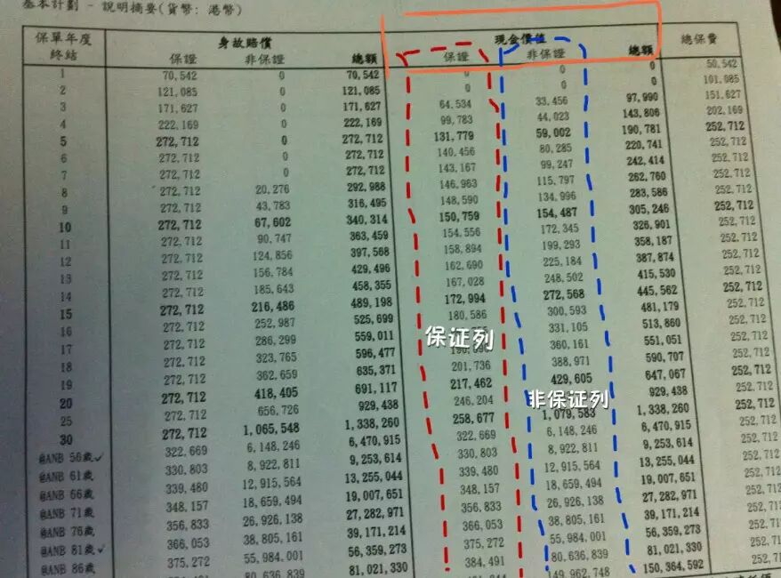 大家看到建议书都觉得非常头大,其实非常非常简单。无论是国内的分红险还是香港的分红险,它都有两列总体回报。一个是保证回报,也就是到了一定的年份,你可以以退保的形式或者是全盘提取的形式拿到这些钱。另外一个就是非保证的,有可能有,有可能没有的,那么我们把这两列分别找出来。