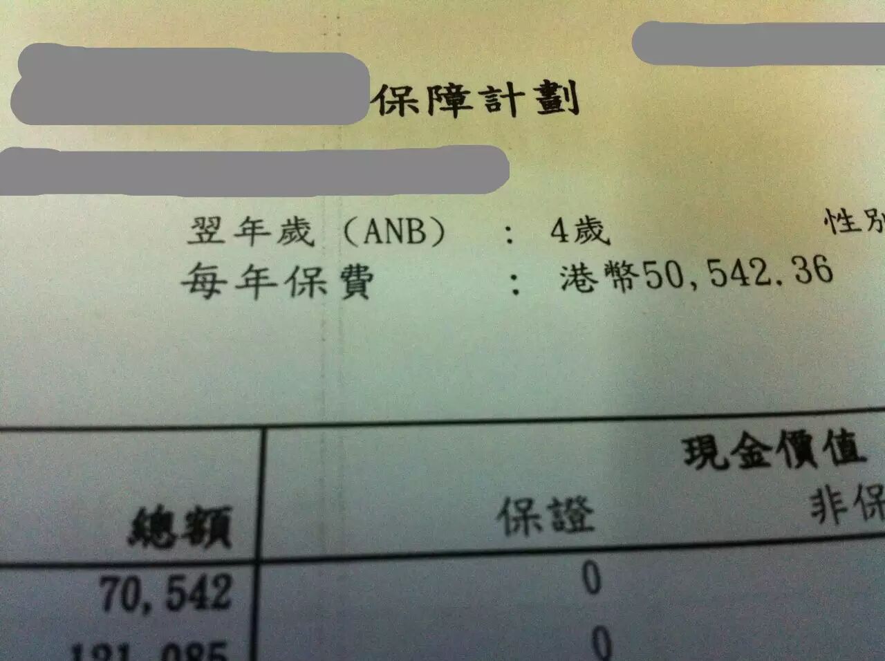 大家看看就晕了,这里有一个很庞大的数据表,那么在这个数据表里,第一个就是我们投资的金额到底有多高,那么这个产品在这里写得非常清楚,每年投资金额是50542港币,投资期是五年,也就是你要连续缴付五年保费。