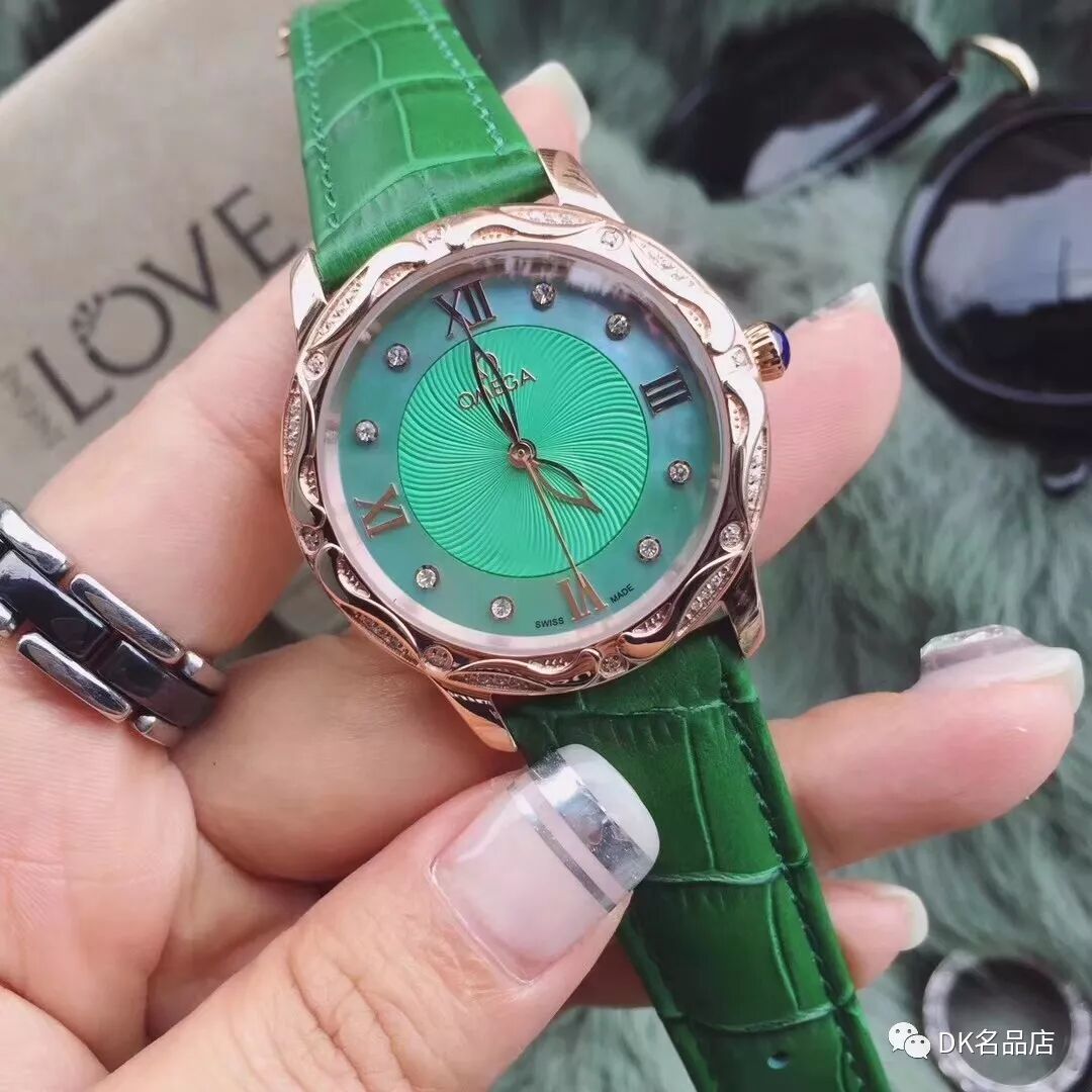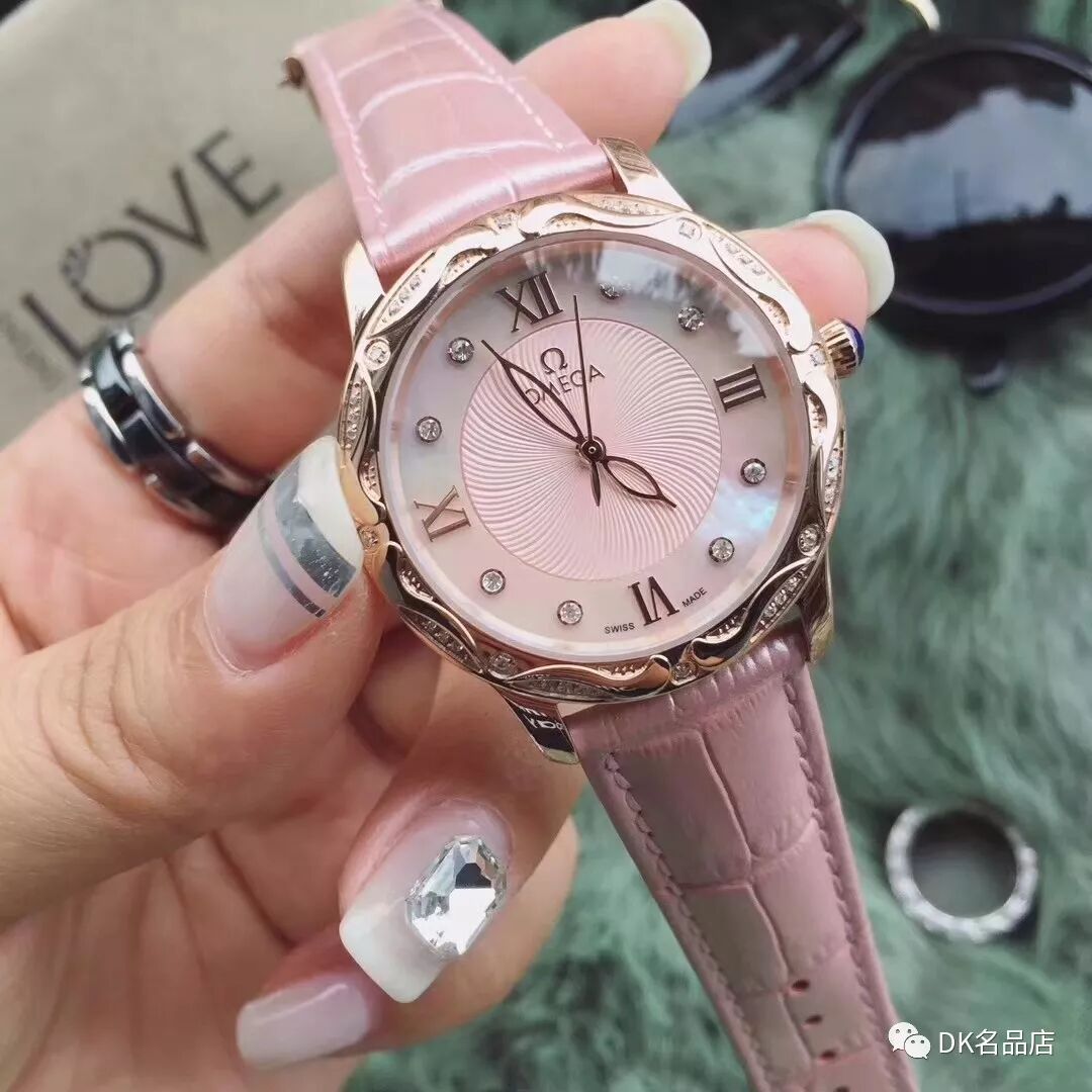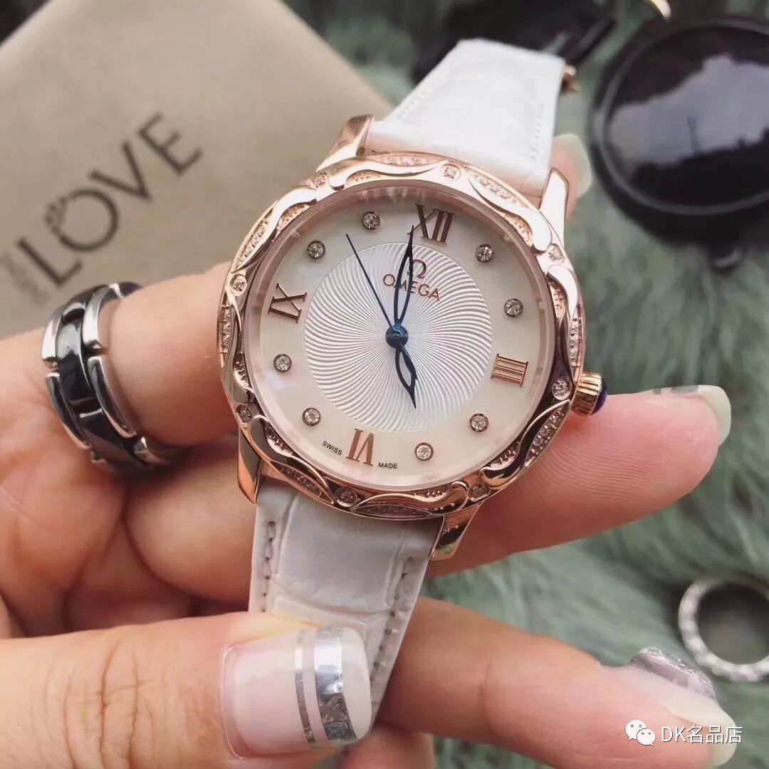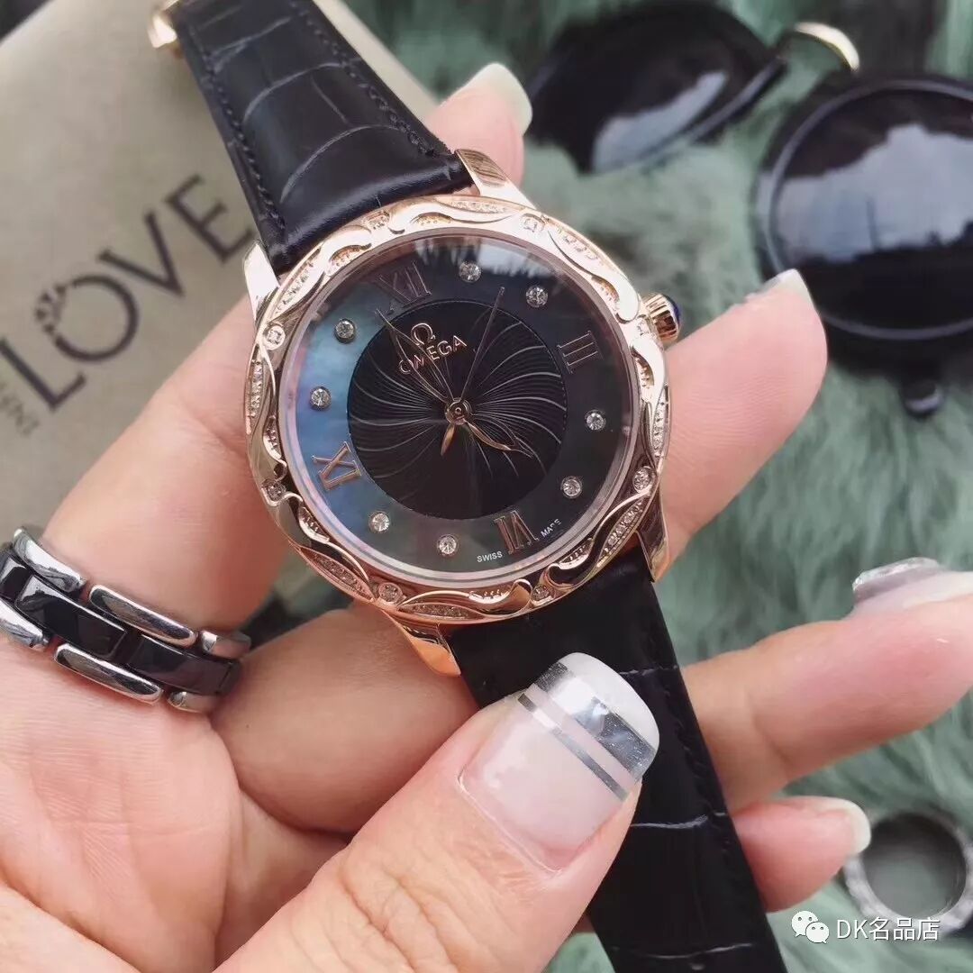 OMEGA【欧米加】新款女士腕表,唯美主义首选,圈口3D立体雕刻和间镶嵌钻石相结合,不仅有浪漫气息和优雅风格更透露出一些古典韵味,深海贝母字面且多色可选,每张字面都显现不同的光彩,316L精钢表壳,进口石英机芯,矿物质钢化拱形镜面,牛皮表带,原装折叠表扣,尺寸:35mm。