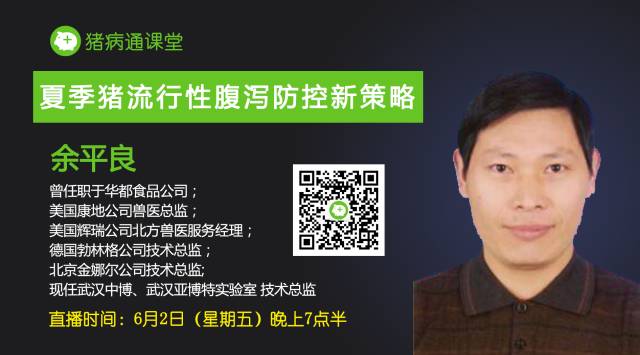 6月2日(星期五)晚上7点半,老兽医直播讲解夏季猪流行性腹泻防控新策略。长按识别上方二维码关注“猪病通”,回复“上课”两字即可免费领取名额哦!