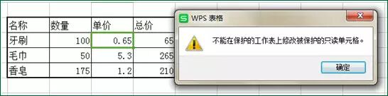 现在我们点击工作表可以发现,除了数量栏可以编辑外,其他地方都显示不能在保护的工作表上修改被保护的只读单元格。