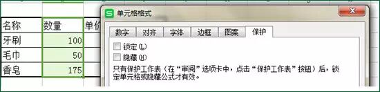 然后选择“数量”列同样调出保护对话框,将锁定和隐藏去掉勾选。