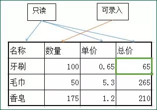 下图是一个物品申购单,为了录入方便我希望锁住“名称”“单价”不被修改,将“总价”内公式隐藏,实现只读功能,同时在“数量”上实现可录入功能,要怎样实现呢?