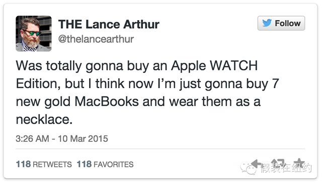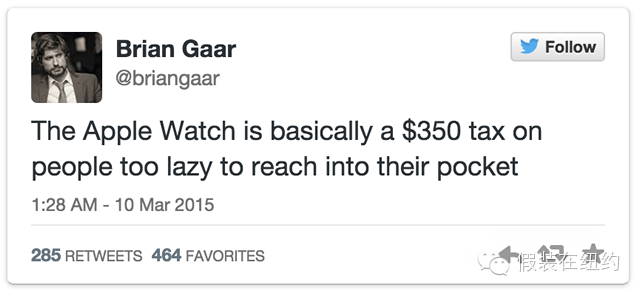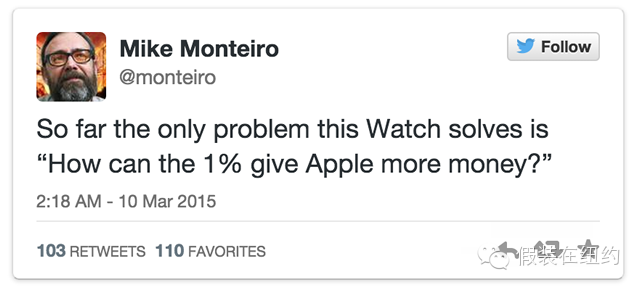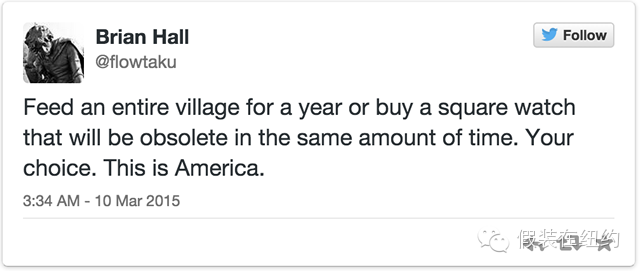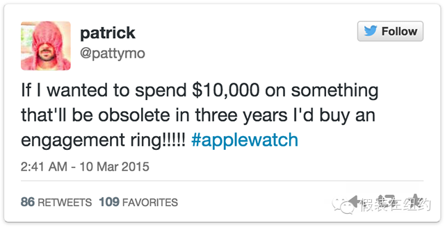 前天苹果发布会前段介绍全新MacBook的时候,推特上一片叫好之声,很多人发帖说“Shut up, just take my money” (什么也别说了,把钱拿走吧)。但是到苹果手表发布时,吐槽就汹涌地来了。