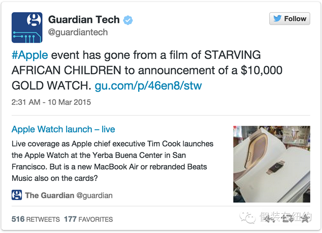 苹果的发布会竟然从非洲贫困儿童的影片跳到了1万美元的金表。(卫报科技频道)