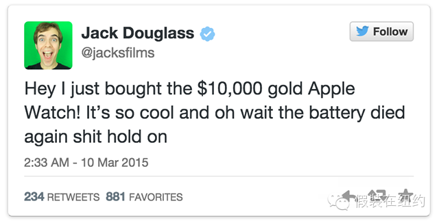 嗨,我刚买了一块1万美元的苹果金表!很酷!哦,等等,电池又没了。