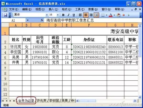 如果能把所有的电子表格数据汇总到同一工作表中,那样查找某些教职工的信息就更方便了,同时也更加便于数据的分析和打印。实现的方法是:在工作薄的最前面插入一张空白的工作表,取名为“合并为记录”,设计需要汇总的项目名称,在“模块1”中定义一个名为hbjl( )的过程并将其指定给该工作表的一个自定义的按钮控件,代码可直接在上面的地址中下载,运行后就可以看到表格中的所有数据都被以记录的方式合并到同一个工作表中去了(图3)。