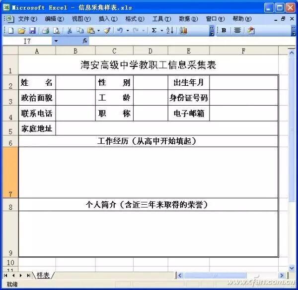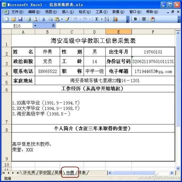 将电子表格文件“信息采集样表.xls”保存后放在FTP服务器上供教职工下载。完成表格的填写后只需将工作簿改为自己的名字,并在规定的时间内上传到FTP指定的文件夹中就可以了。负责汇总的老师把该文件夹下载到本地后即完成了电子表格文档的收集。