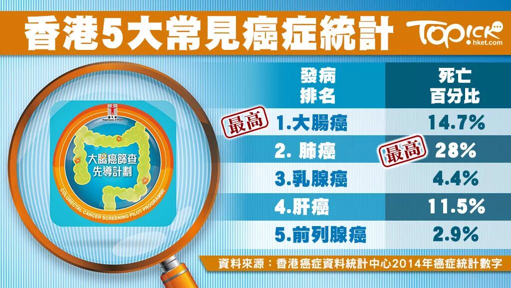 啥?大肠癌发病率竟然超过肺癌(15.8%),一跃成为香港第一“癌症杀手”,高达16.8%!而且大肠癌的死亡率也非常高,占全部癌症死亡个案的14.7%,仅次于肺癌!