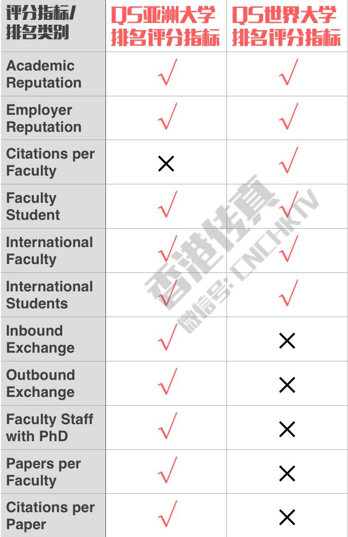 没错,比如在最新发布的QS世界大学排名中,香港大学排名26,高出香港科技大学4位,之所以出现QS亚洲榜单跟QS世界榜单排名的差异,是由于亚洲榜单的评分指标比世界大学排名多了几项,香港传真(微信号:cnchktv)大致梳理了一下二者的差异: