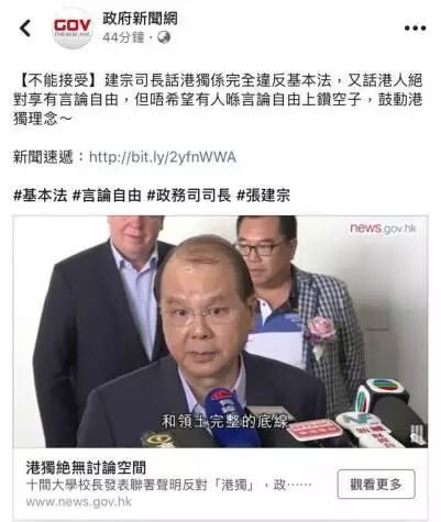据香港政府新闻网9月16日消息,张建宗今日出席活动后会见媒体时说,鼓吹“港独”是挑战国家主权和领土完整的底线,不能容忍。他希望校方妥善处理,让事件告一段落,同学也应集中精神讨论其他议题。